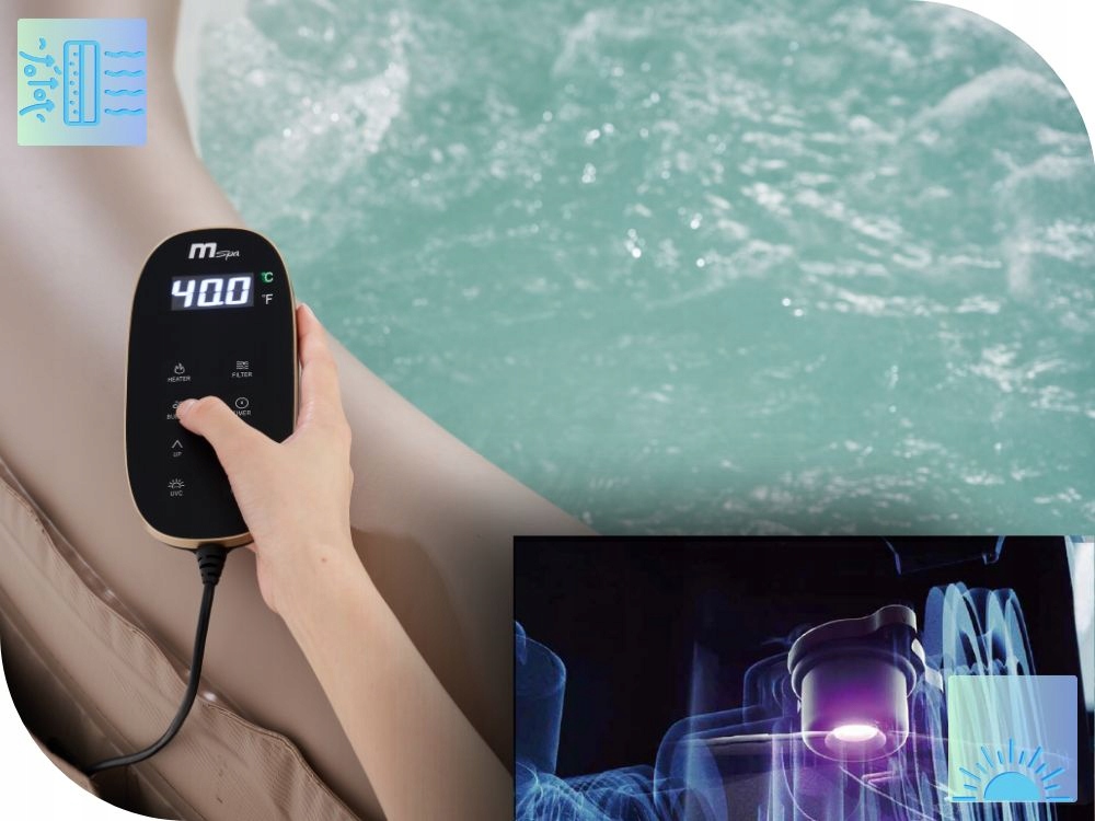 побудована лампа UVC виключає понад 60 типів мікроорганізмів та збудників за допомогою самого світла. Міні -стерилізаційна камера з світлодіодним світлодіодом UVC - це коробка управління спа -центром. Він працює раніше, під час і після купання, забезпечуючи постійний захист кожної краплі води протягом тижня. Завдяки цьому, використання хімічних речовин може бути зменшено до мінімуму.