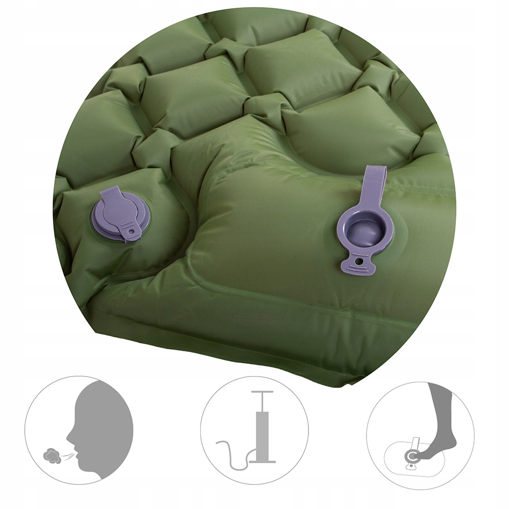 Унизу є стандартний клапан для надування, який дозволяє надувати килимок за допомогою насоса або рота. Ви також можете оцінити подушку для кроку, яка дозволяє надути килимок, навіть якщо у вас немає насоса або у вас низький об’єм легенів. Все, що вам потрібно зробити, ценаступити на нього або стиснути його кілька разів і килимок готовий!