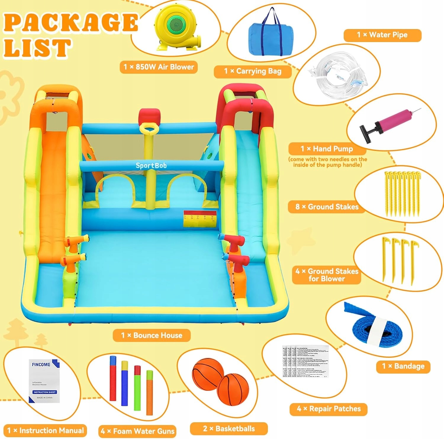 Надувний замок пропонує багато розваг на різних рівнях. Оснащений водними гірками, басейном, зоною для стрибків і баскетбольним кільцем, цей продукт пропонує незліченну кількість розваг протягом усього року. Ідеальне рішення для будь-якої вечірки чи сімейної зустрічі.