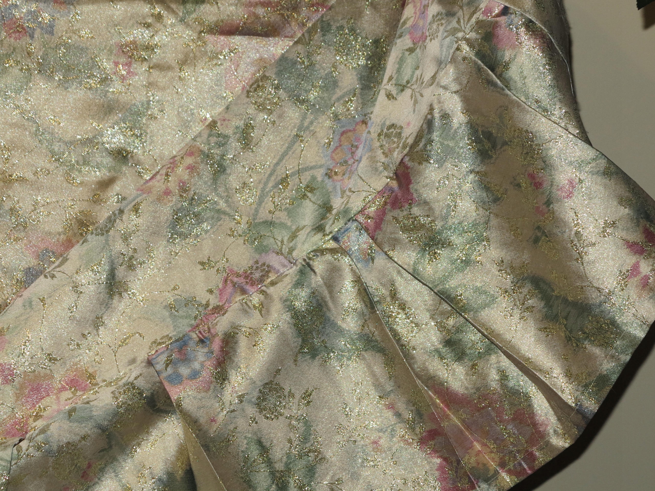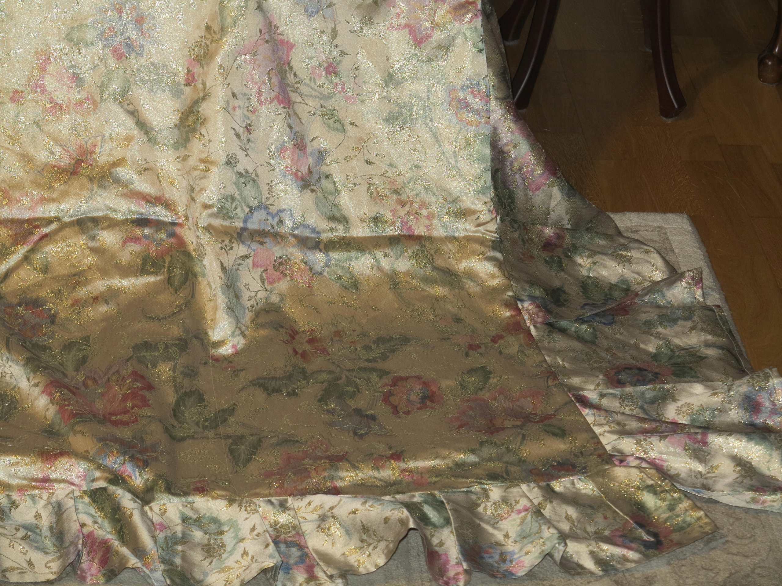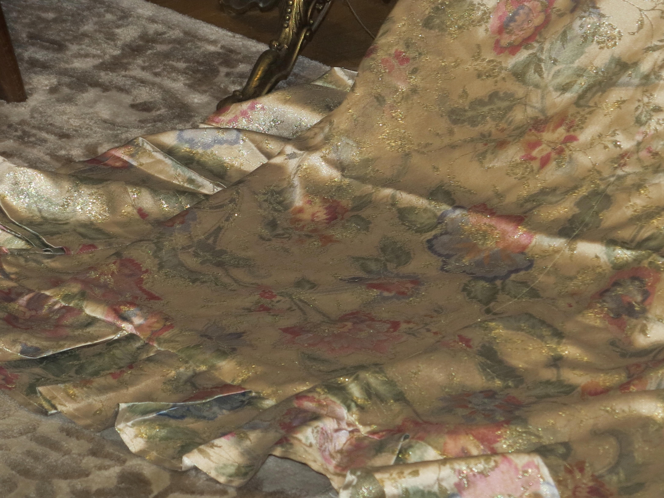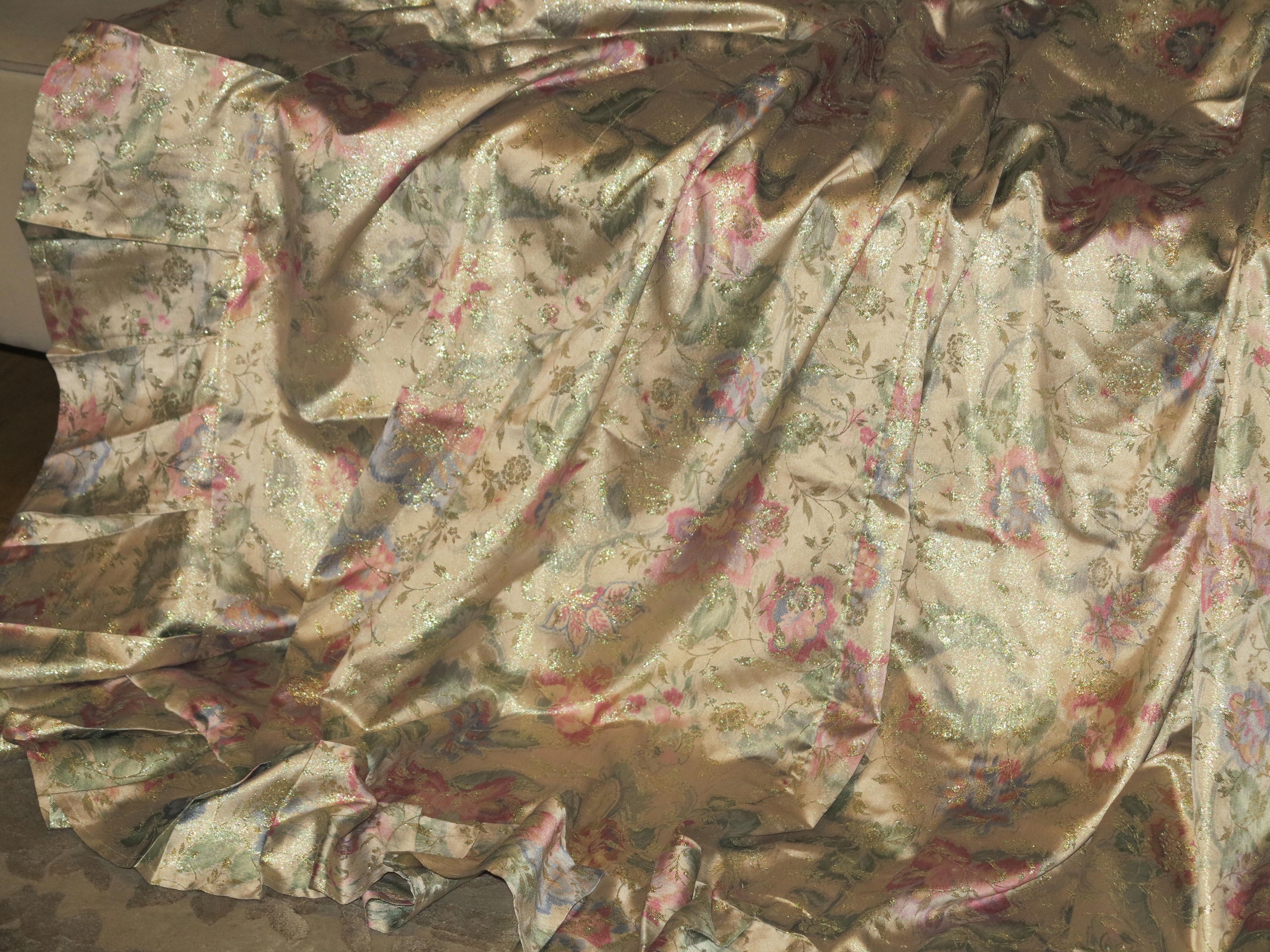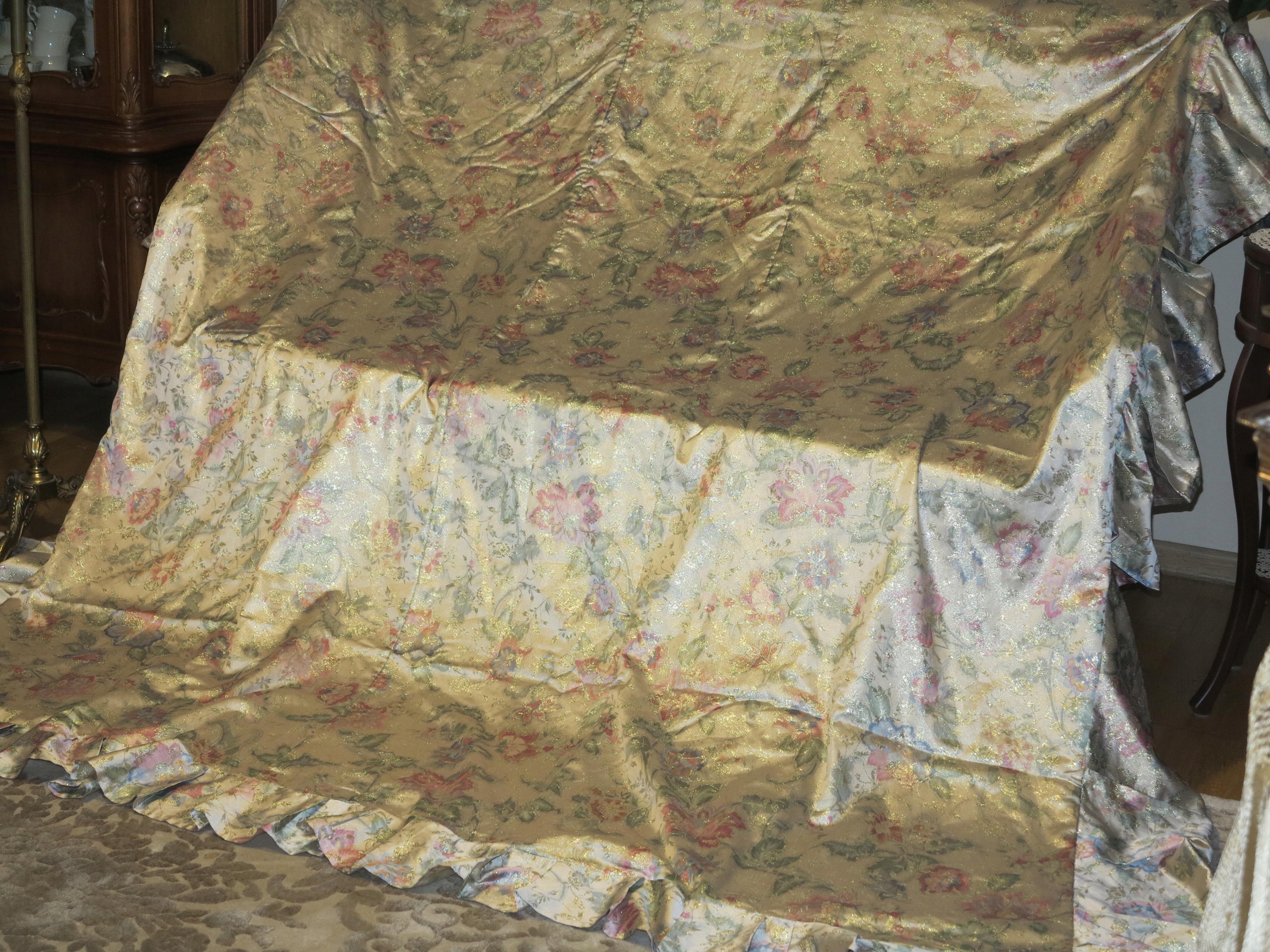 НАДЗВИЧАЙНЕ КРАСИВЕ АНГЛІЙСЬКЕ ПОКРИВАЛО ДЛЯ СТИЛЬНОГО ІНТЕР'ЄРУ, ЩО ПЕРЕЛИВАЄ РЯЧНИМ ЗОЛОТИМ ПЕРЕЛИВОМ. ЗОЛОТИСТИЙ БЕЖЕВИЙ КОЛІР, КВІТКОВІ ВИЗЕРУНКИ БЛІДО-РОЖЕВОГО ТА ЗЕЛЕНОГО. ЗАГАДКА НА ТРИ БОКИ. ОБШИТАНА ЗНИЗУ ДОДАТКОВИМ ШАРОМ МАТЕРІАЛУ. Є ДВА ОРИГІНАЛЬНИХ СИМЕТРИЧНИХ СПІКІВ ТКАНИНИ ЧЕРЕЗ ЦЕНТР