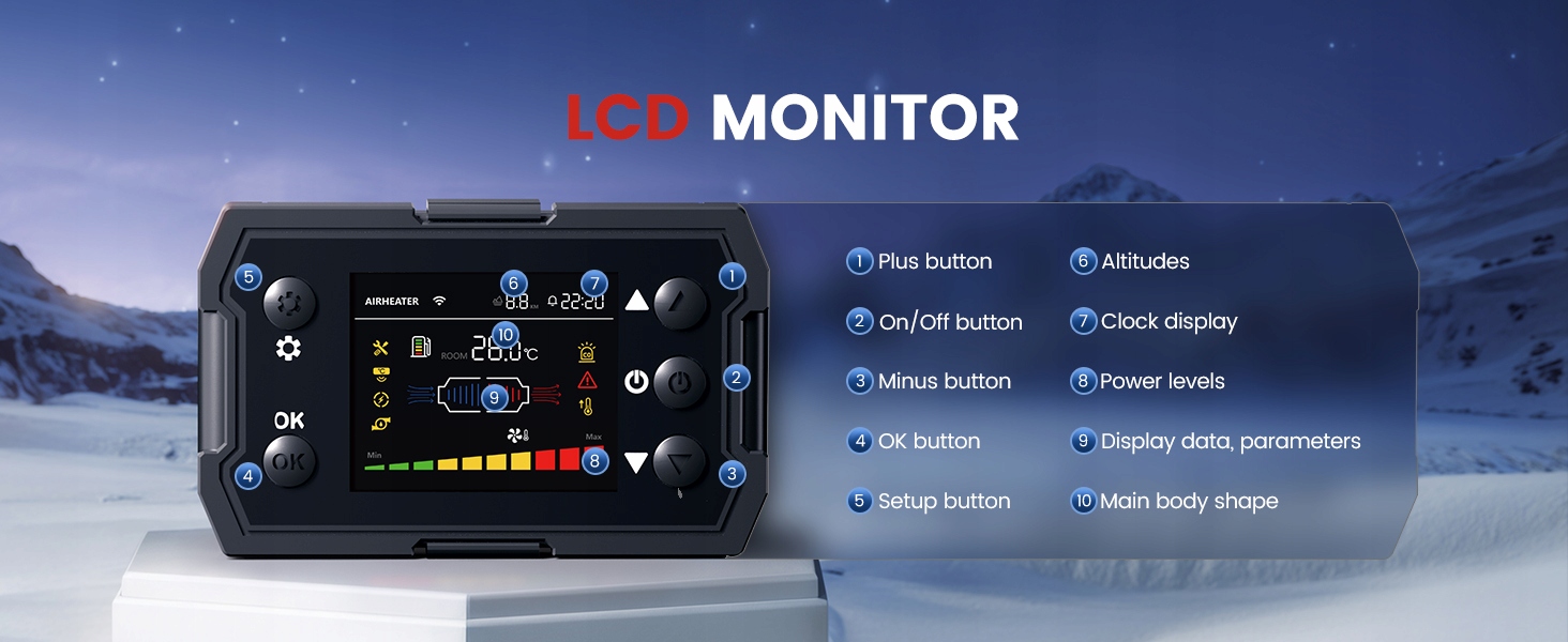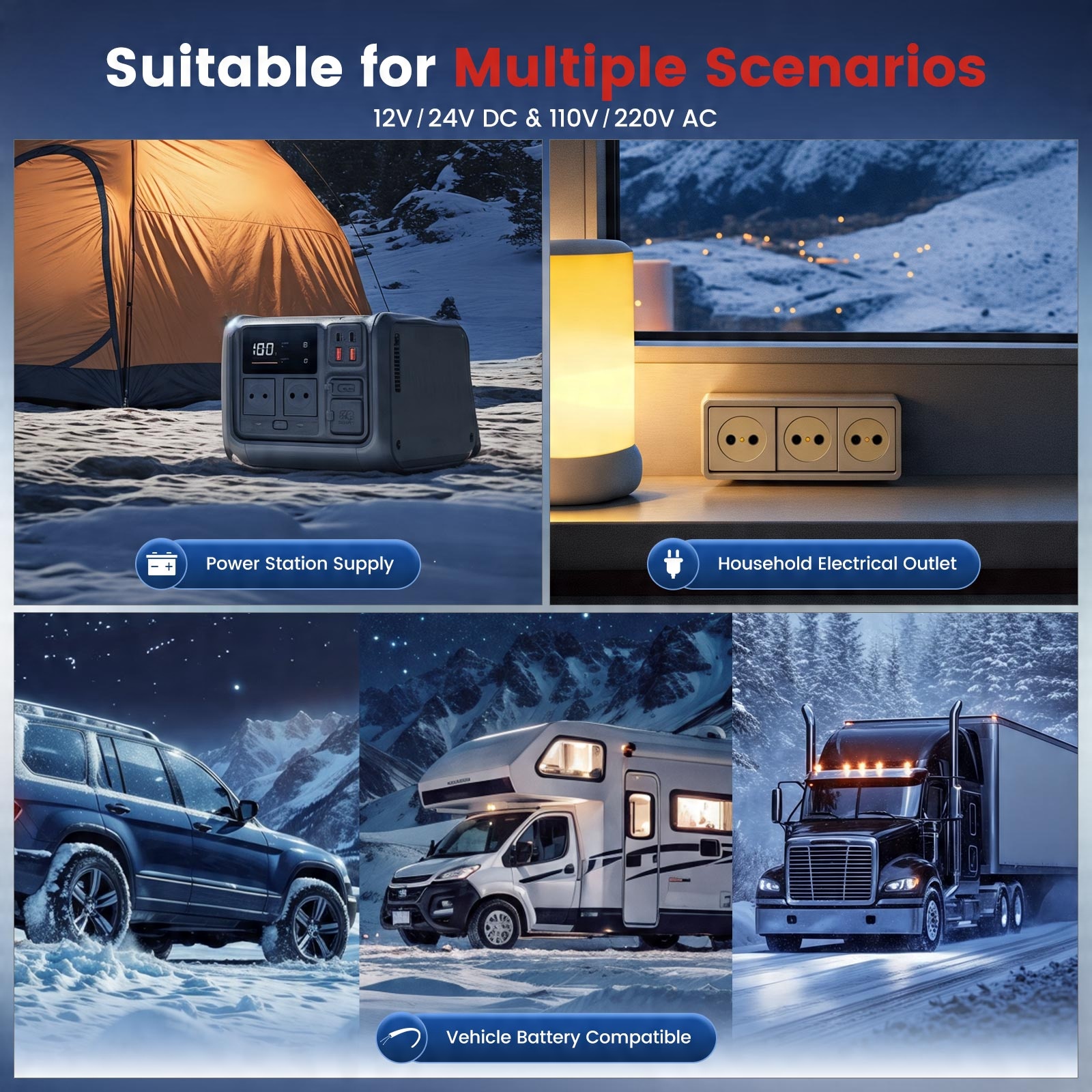 Параметри подвійної потужності: Цей універсальний дизельний нагрівач повітря підтримує джерела потужності 12 В/24 В постійного струму, і 220 V-240 В змінного струму. Він може бути підключений до домашньої напруги за допомогою адаптера, задовольняючи потреби в різних сценаріях.