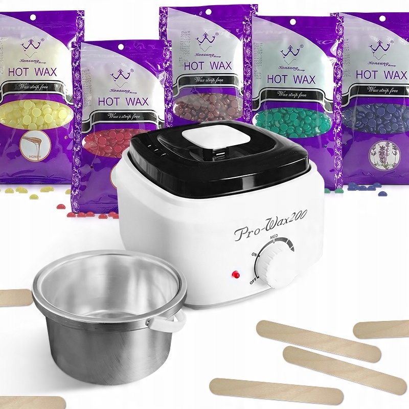 Як використовувати: Помістіть паперову кришку на край пристрою, щоб захистити нагрівач від бруду. Відкрийте банку з воском і помістіть її в нагрівач. Поверніть ручку, щоб розтопити віск. Коли це станеться, перемкніть на середину, щоб нагрівач підтримував постійну температуру. Розігріваючи віск, підготуйте ділянку тіла, де буде проводитися депіляція. Перед депіляцією знежирюємо тіло відповідним косметичним засобом і наносимо тальк. Перед нанесенням воску на шкіру перевірте його температуру! Дуже гарячий віск може викликати опіки. Віск повинен бути рідким - він не повинен бути тягучим. Нанесіть віск на тіло паличкою, стежачи за ростом волосся, покриваючи його тонким шаром воску. Прикладіть смужку з флізеліну і притисніть. Одразу після натискання енергійно відірвіть смужку рухом проти волокна. Рекомендується не наносити віск на зону депіляції більше двох разів. Після процедури видаліть залишки воску маслом і нанесіть бальзам після депіляції.