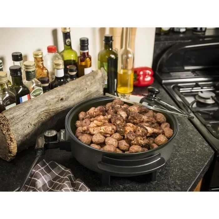 - пункт: , Ідеально підходить для вечірок з сім'єю або друзями в саду, на балконі або в кемпінгу, швидкий час нагрівання за кілька хвилин і постійне збереження тепла, 5-ступінчастий, знімний термостат зі світловим індикатором (115 °C до 220 °C), легке очищення за допомогою рука вологою ганчіркою, термоізольовані ручки та нековзні ніжки, скляна кришка з паровідводом та ручкою, довжина кабелю: 100 см,