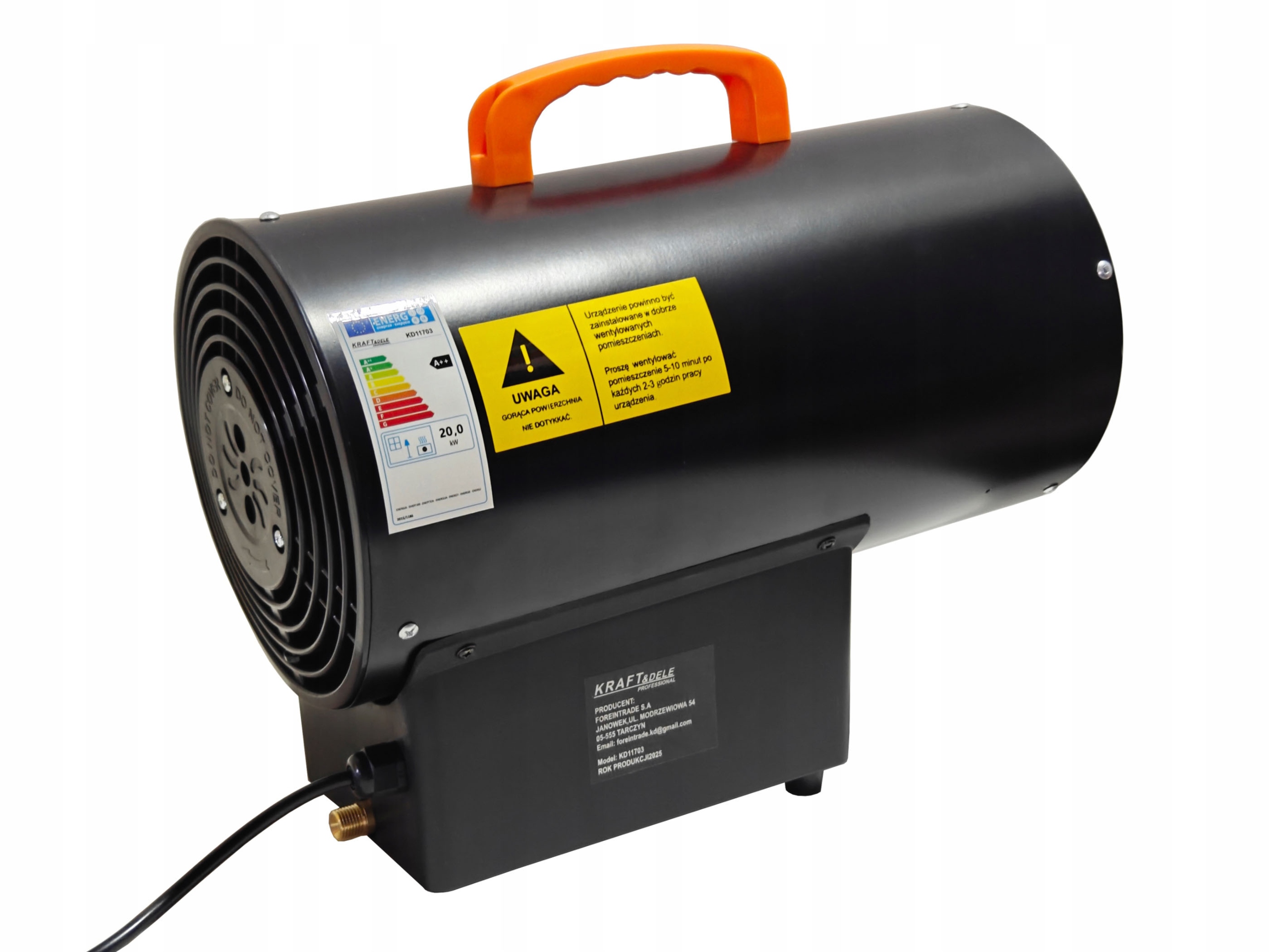 Газовий обігрівач - це пристрій, призначений для швидкого, ефективного та безпечного обігріву приміщень, де важливі ефективність і надійність. Завдяки потужності 20 кВт, міцній конструкції та якісним комплектуючим він забезпечить вам тепловий комфорт навіть у найскладніших умовах. Мобільний, енергозберігаючий і простий у використанні - його можна використовувати в майстернях, на складах і на будмайданчиках. Вбудований вентилятор з потоком повітря 320 м³/год забезпечує рівномірний розподіл тепла, що дозволяє досягти бажаної температури за короткий час. Kraft&Dele — це бренд, який поєднує в собі інновації, довговічність і функціональність, пропонуючи обладнання, готове до інтенсивної роботи щодня.