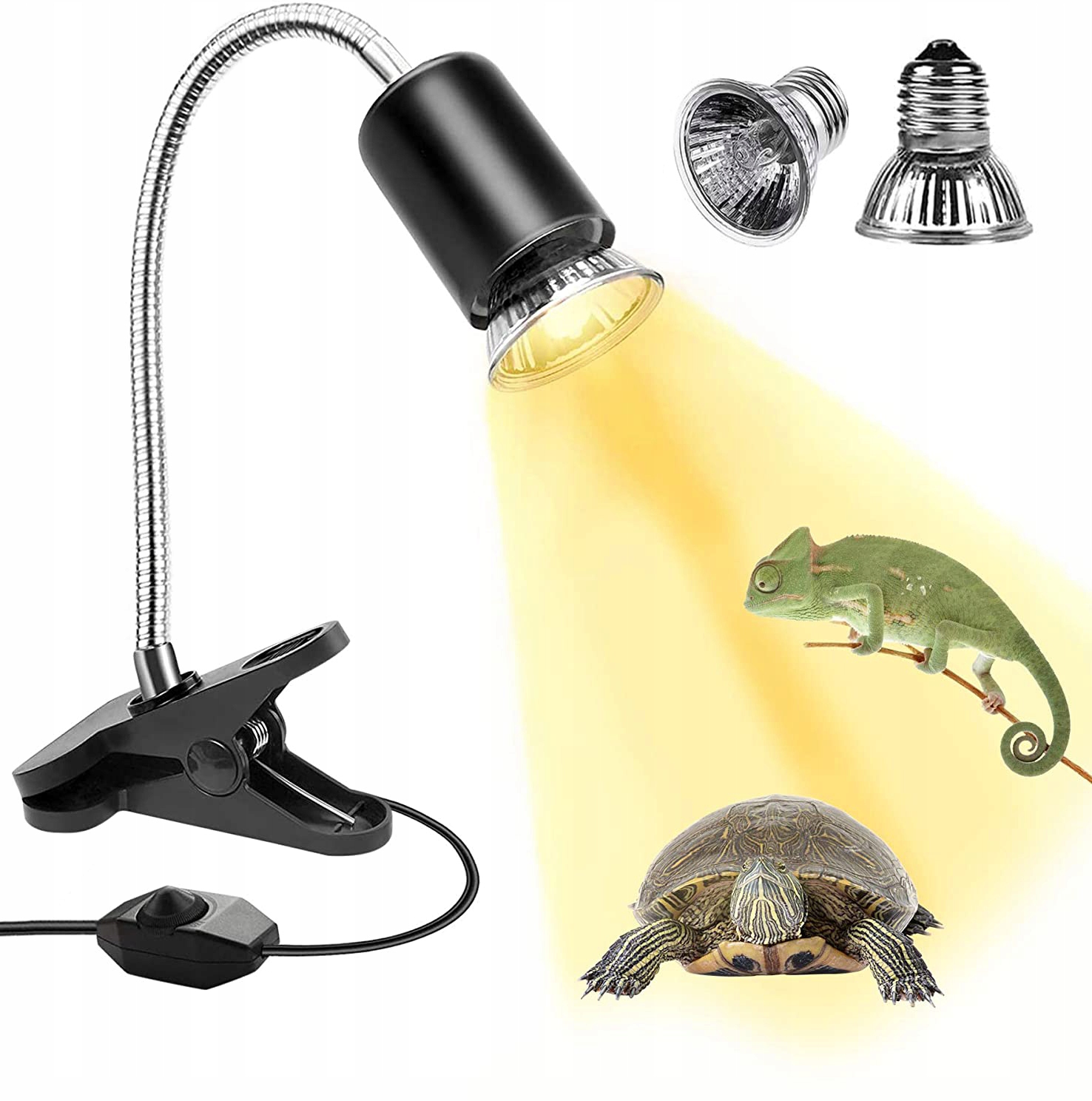 💡💡💡【 Регульована температура та яскравість】 У наборі 2 нагрівальних лампочок (25 Вт і 50 Вт). Рама також підходить до інших джерел світла E27, таких як люмінесцентні світильники, розжарювання, кераміка, УФ, світлодіод тощо. Він також оснащений ручкою, що забезпечує вільне регулювання бажаної температури та яскравості. Влітку температуру можна знизити і взимку, щоб запобігти сперму черепахи через її неможливість регулювати температуру.