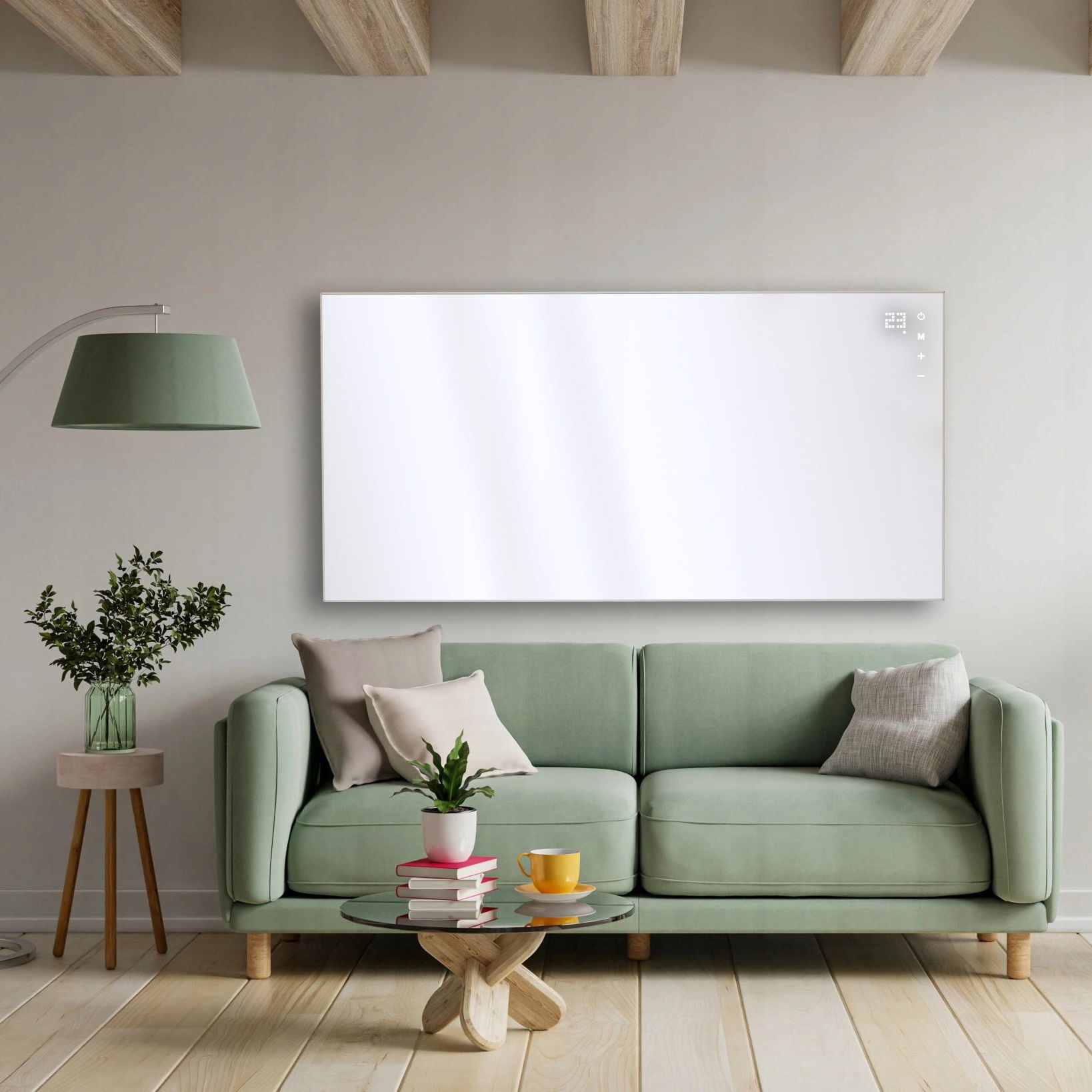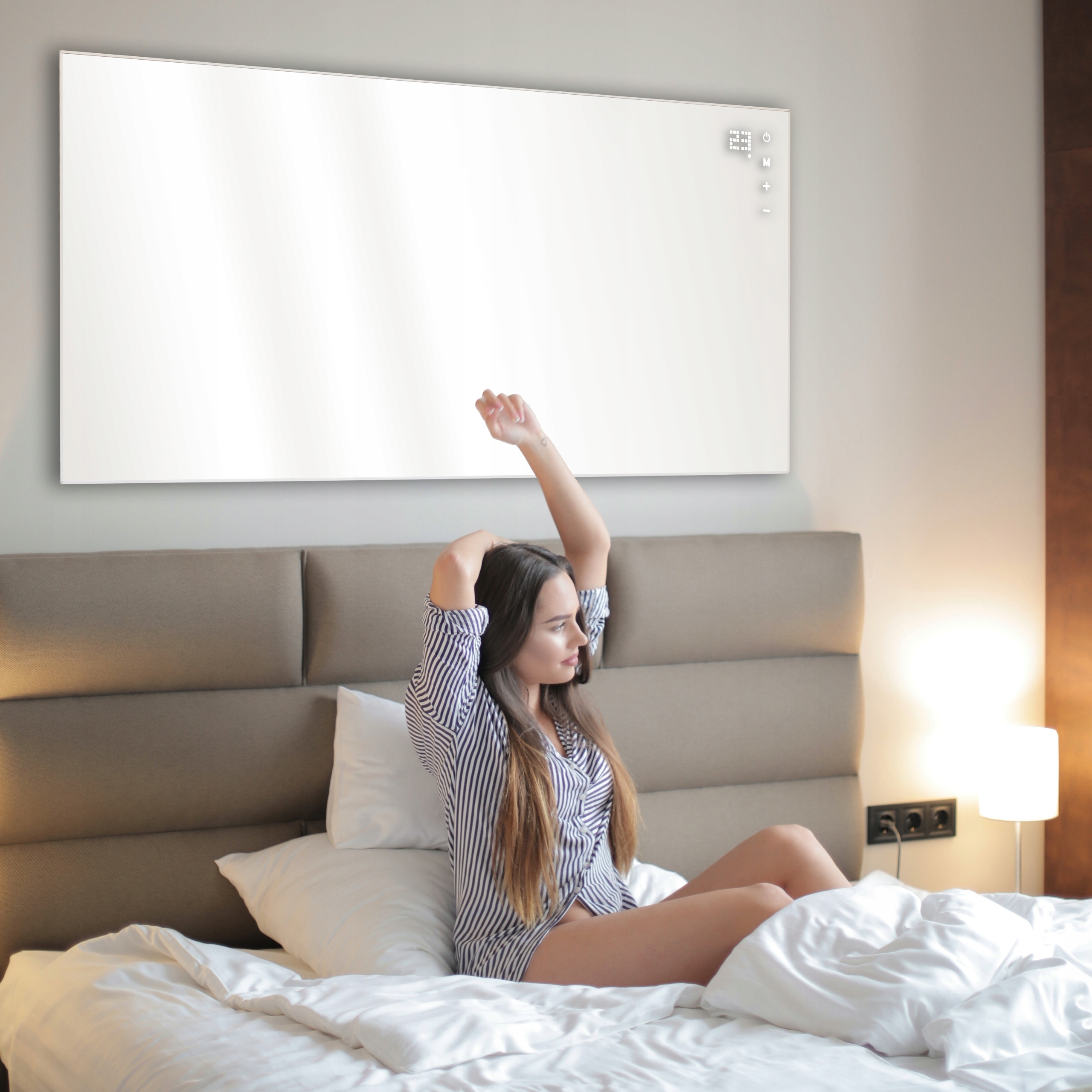 Товщина всього 16 мм - панель оздоблена стильною білою алюмінієвою рамою. Настінні кріплення відсувають панель на 27 мм від стіни, щоб забезпечити безпечну циркуляцію повітря. Традиційні конвекційні обігрівачі займають не менше 100-120 мм простору.