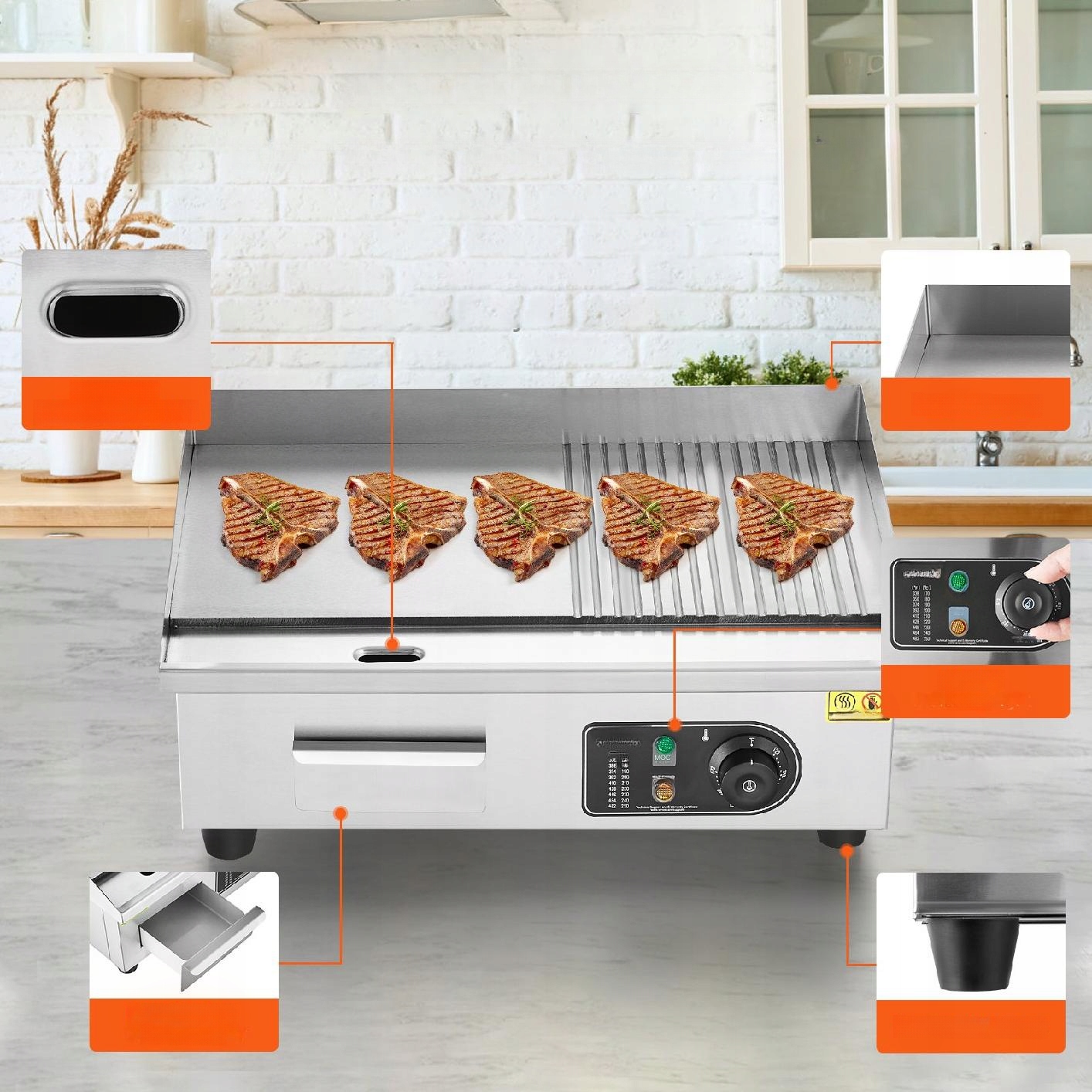 Комерційний електричний гриль із плоским верхом підходить як для домашнього, так і для комерційного використання, наприклад, ресторанів, магазинів, придорожніх кіосків і закусочних. Ідеально підходить для приготування млинців, хрусткого бекону, сиру на грилі, ситних сніданків, смажених страв, омлетів, піци, стейків і гамбургерів.