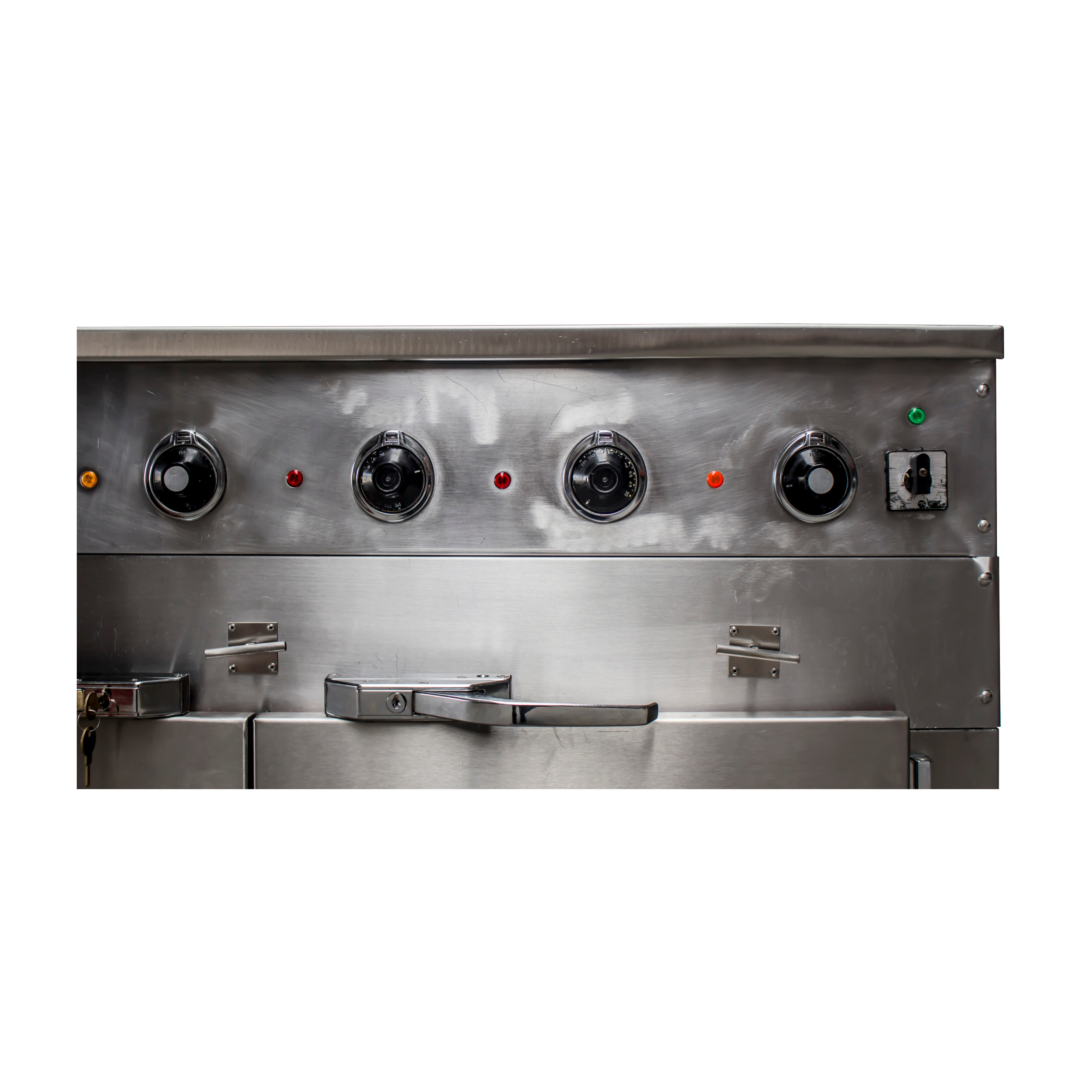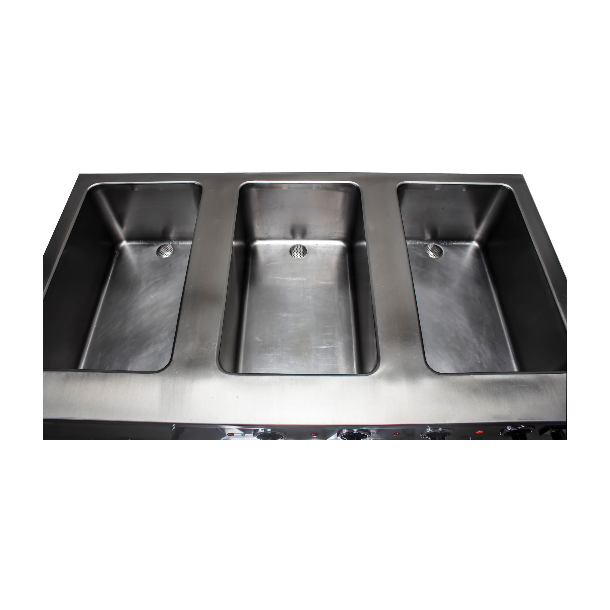 Регулювання температури забезпечує гнучкі налаштування залежно від ваших потреб, і кожна камера контролюється окремо, що дозволяє налаштувати марміт відповідно до ваших потреб. Батарея повністю виготовлена з нержавіючої сталі. Пристрій має 3 камери, які можуть вмістити 3 1/1 контейнери GN, і шафу з підігрівом.