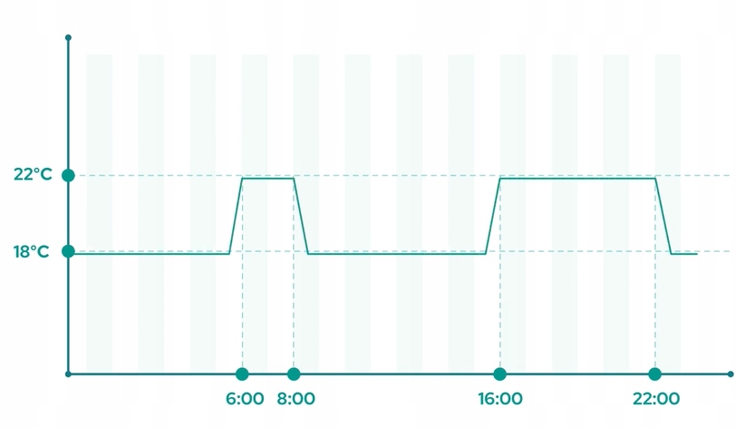 Термостат пропонує шість програмованих періодів (5+1+1), що дозволяє індивідуально налаштовувати окремі робочі та вихідні дні.