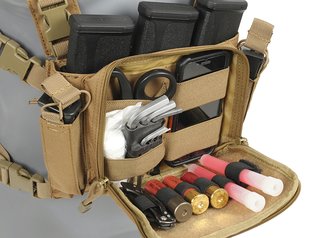 Цей нагрудний інструмент є справжнім багатофункціональним інструментом у світі тактичного спорядження. Він пропонує багато варіантів зберігання , включаючи боєприпаси, магазини різного калібру та інші необхідні предмети. Він оснащений кишенею-кенгуру для гнучких вкладишів магазину (вкладиші доступні окремо - не входять до комплекту, показано на фотографіях для ілюстрації), що дозволяє адаптувати його до ваших потреб і типу зброї, яку ви використовуєте. Крім того, він має багатофункціональну кишеню для вантажів, у яку можна помістити великі предмети, і 2 невеликі кишені для магазинів до пістолетів чи інших дрібних аксесуарів, таких як ножі чи ліхтарики.