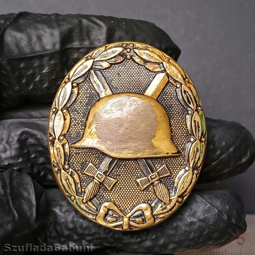 Чорний значок поранення Третього Рейху, латунь; Значок Другої світової війни після денацифікації – свастику прибрали; сліди потертості, сліди чорної фарби.