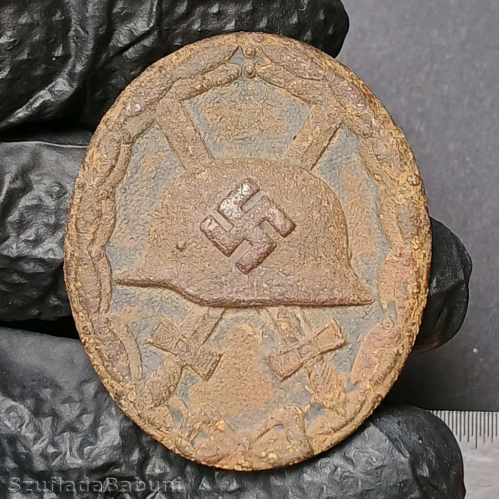 Wound Badge, black, Third Steel Reich; Значок часів Другої світової війни з невеликою корозією, залишки чорної фарби, зламана оригінальна шпилька (входить у комплект).