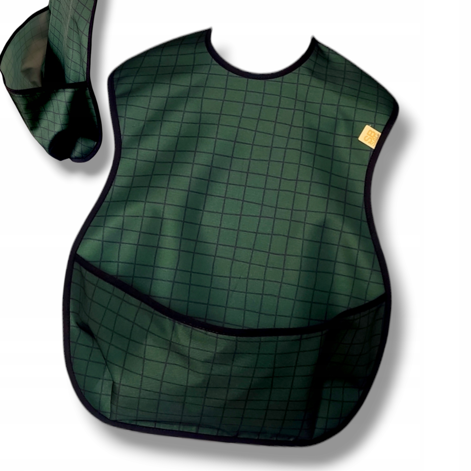 Нагрудник легкий, водонепроникна прогумована тканина. захищає від бруду, і при цьому залишається комфортним при контакті з тілом. Дуже важливою особливістю наших виробів є відкидна кишеня, яка вловлює падаючі залишки їжі чи напоїв. Глибина кишені запобігає падінню під час нахилу. Форма нагрудника нагадує пісочний годинник. Закриває плечі, звужується в області руху рук - тому не рухається, і знову розширюється внизу. Додатковою перевагою наших нагрудників є легкість чищення та швидка готовність до повторного використання. Наші вироби відрізняються невеликою вагою і м'якістю. Бавовняна облямівка навколо нагрудника та шнурки для застібки не подразнюють шкіру. Зав'язування є найефективнішим - швидким і виключає ризик того, що пацієнт зніме нагрудник самостійно, і дуже міцним на відміну від липучок, які швидко виготовляються і можуть дратувати, або гачки, які легко «розробляє» дитина. Крім того, зав’язка дозволяє нагруднику ідеально прилягати до шиї, щоб уникнути потрапляння бруду під нагрудник.