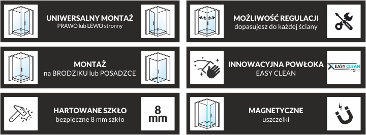 - Матеріал: загартоване скло на стіні та дверях (8 мм) + безбарвне покриття Easy Clean, хромовані алюмінієві профілі, магнітні ущільнення,