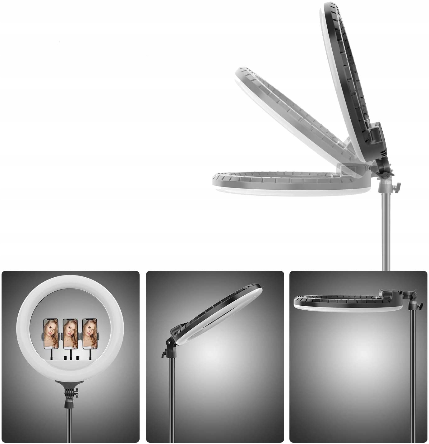| Кільцева лампа штатива 3 кріплення 2 власників телефонів та регулювання інтенсивності дзеркала