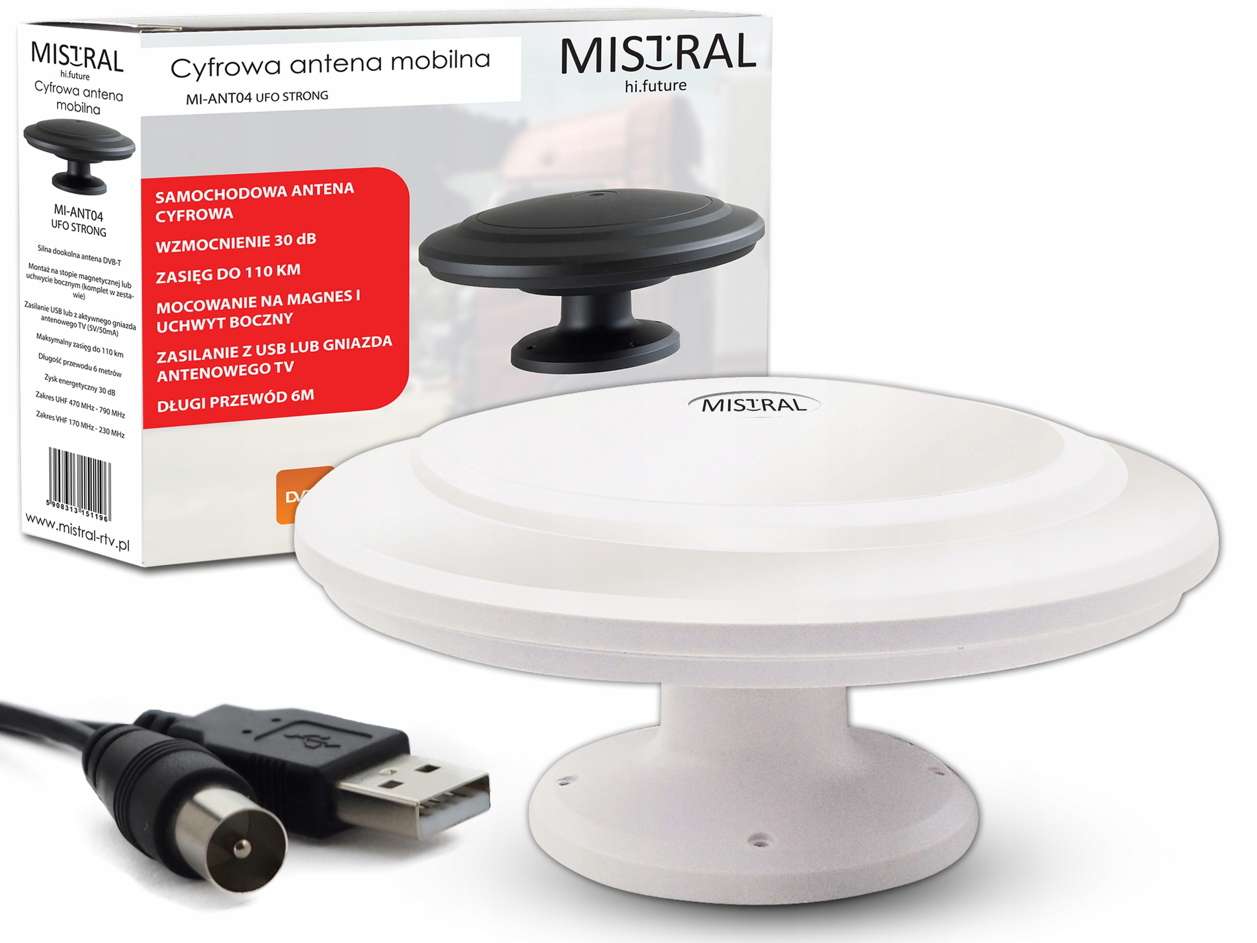 Міцна та водонепроникна активна мобільна DVB-T антена Mistral MI-ANT04 UFOSTRONG 3в1 на магніті, кронштейн для настінного кріплення, постійна основа, цифрова всеспрямована вулична DVBT автомобільна телевізійна антена білого кольору з посиленням до 30 дБ
