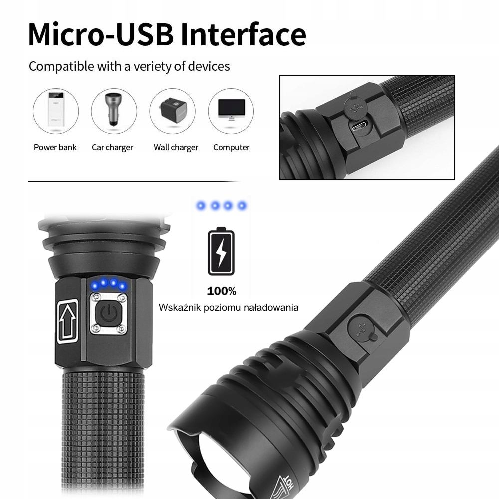Ліхтарик можна зручно заряджати через роз’єм USB від настінного зарядного пристрою, автомобільного зарядного пристрою, комп’ютера або навіть від акумулятора живлення !