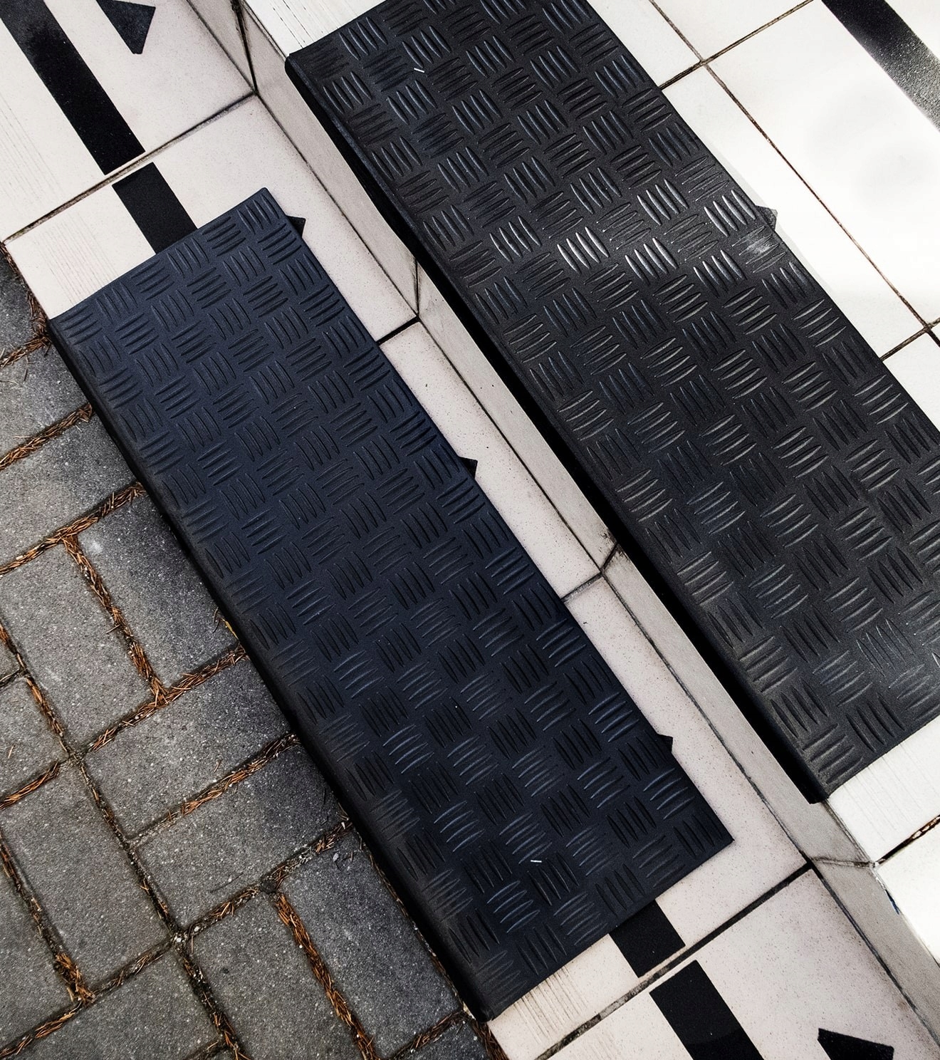 Виготовлений із міцного, чорного гумового покриття сходів для використання на вулиці. Кришка з високими параметрами ковзання та гнучкістю, зберігаючи свою форму.