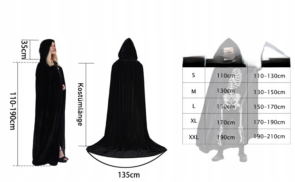 Капюшон глибокий і широкий - дозволяє прикрити обличчя, що створює надзвичайно загадковий ефект. Ідеально підходить для костюмів вампіра, чарівниці, чарівника, готичного та фентезійного костюмів.