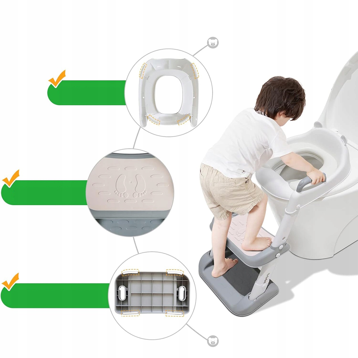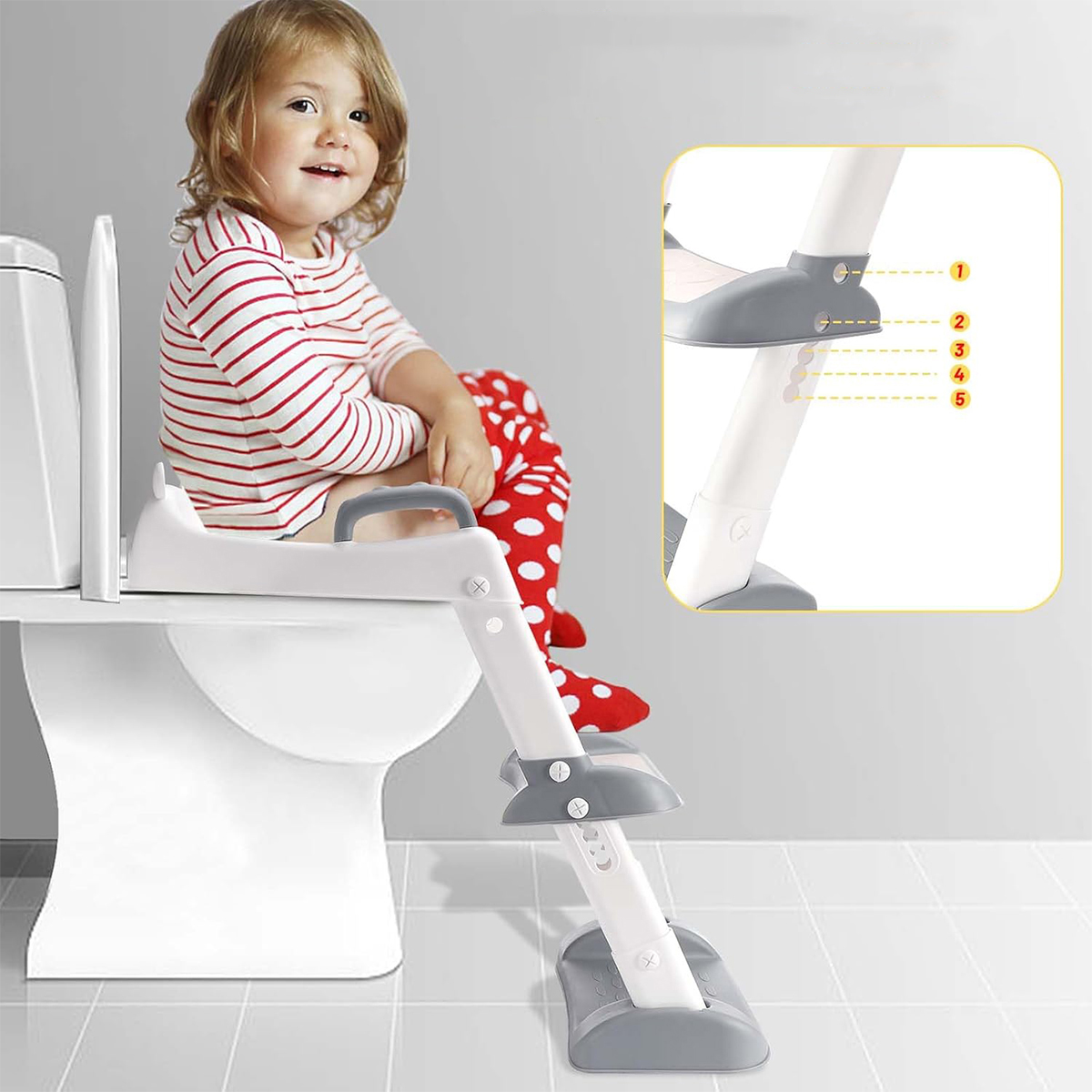 Завдяки двом поручням і широкій педалі сидіння унітазу дозволяє дітям самостійно підніматися та злізати з нього. Це дозволяє дітям безпечно та комфортно користуватися туалетом, а регульована висота дозволяє підлаштувати його під дітей різного розміру, що сприяє ефективному привчанню до горщика.