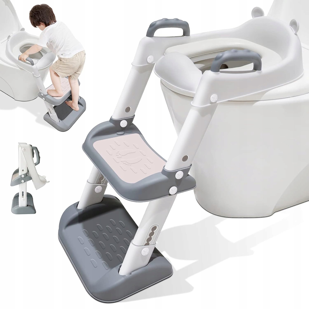 Toilettensitz Kinder WC, Toilettensitz Toilettentrainer with Treppe, Verstellbar Toilettentrainer with PVC Gepolsterter, Spritz- und Rutschfestes, für Jungen und Mädchen Baby (grau-weiß)