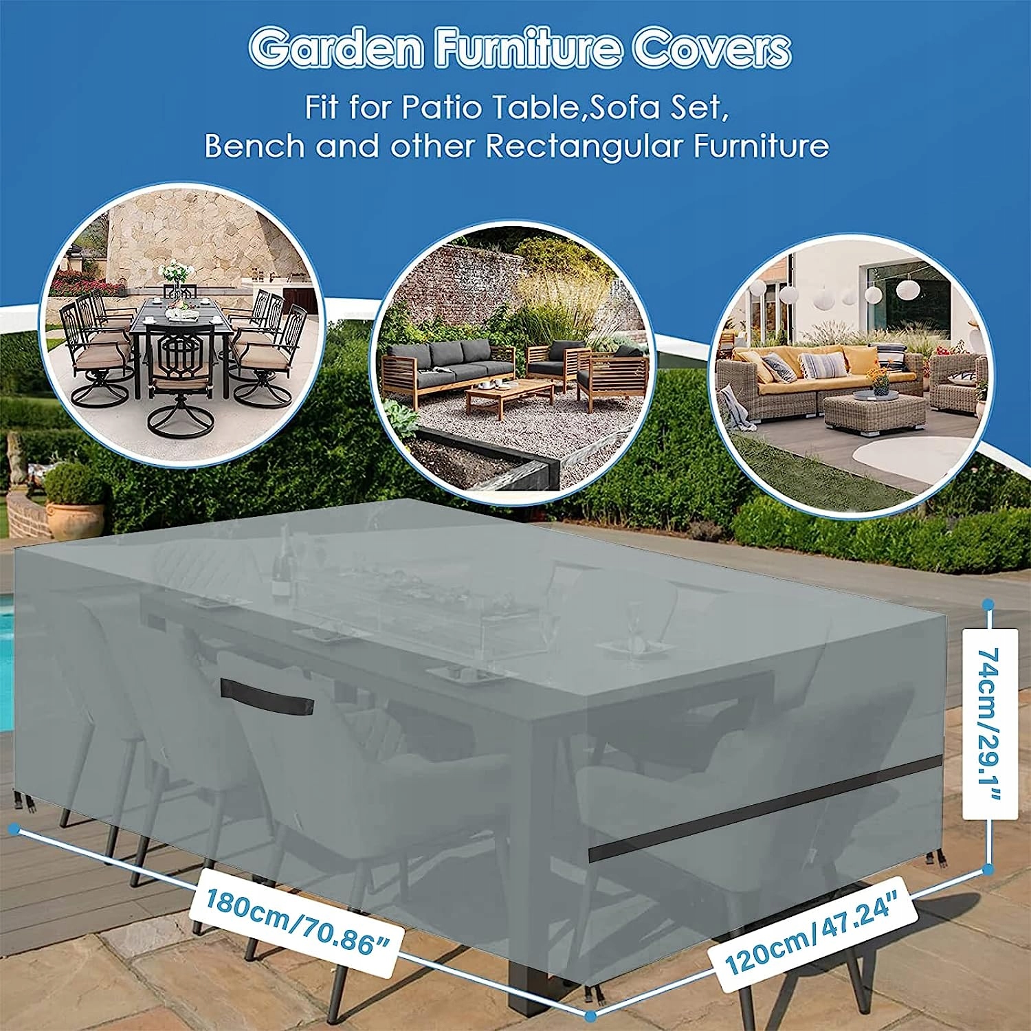 180 x 120 x 75 см. Підходить для більшості форм, таких як обідній стіл, стіл і стільці, 8 місць, стіл для пікніка, комплект меблів з ротанга, диван тощо. Його також можна використовувати для внутрішнього та зовнішнього використання, наприклад, на балконі, у саду, на патіо. Завдяки своєму розміру накриття для столика ідеально підходить для ваших меблів.