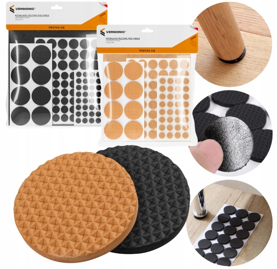 Подушки не вимагають використання інструментів, оскільки вони забезпечені міцним клеєм на дні. Просто зніміть їх із щитка та помістіть у відповідне місце під меблями. Подушечки виготовлені з дуже міцного повсті та поролону. Набір містить 93 предмети різних розмірів.