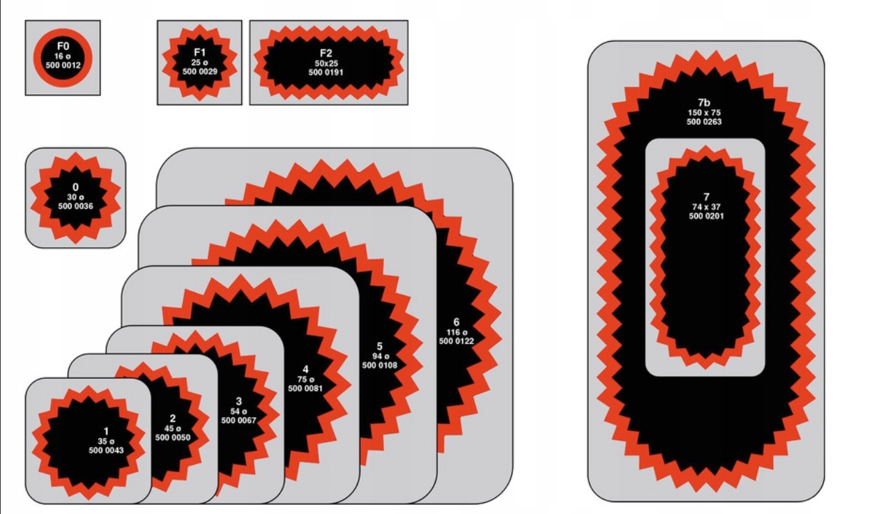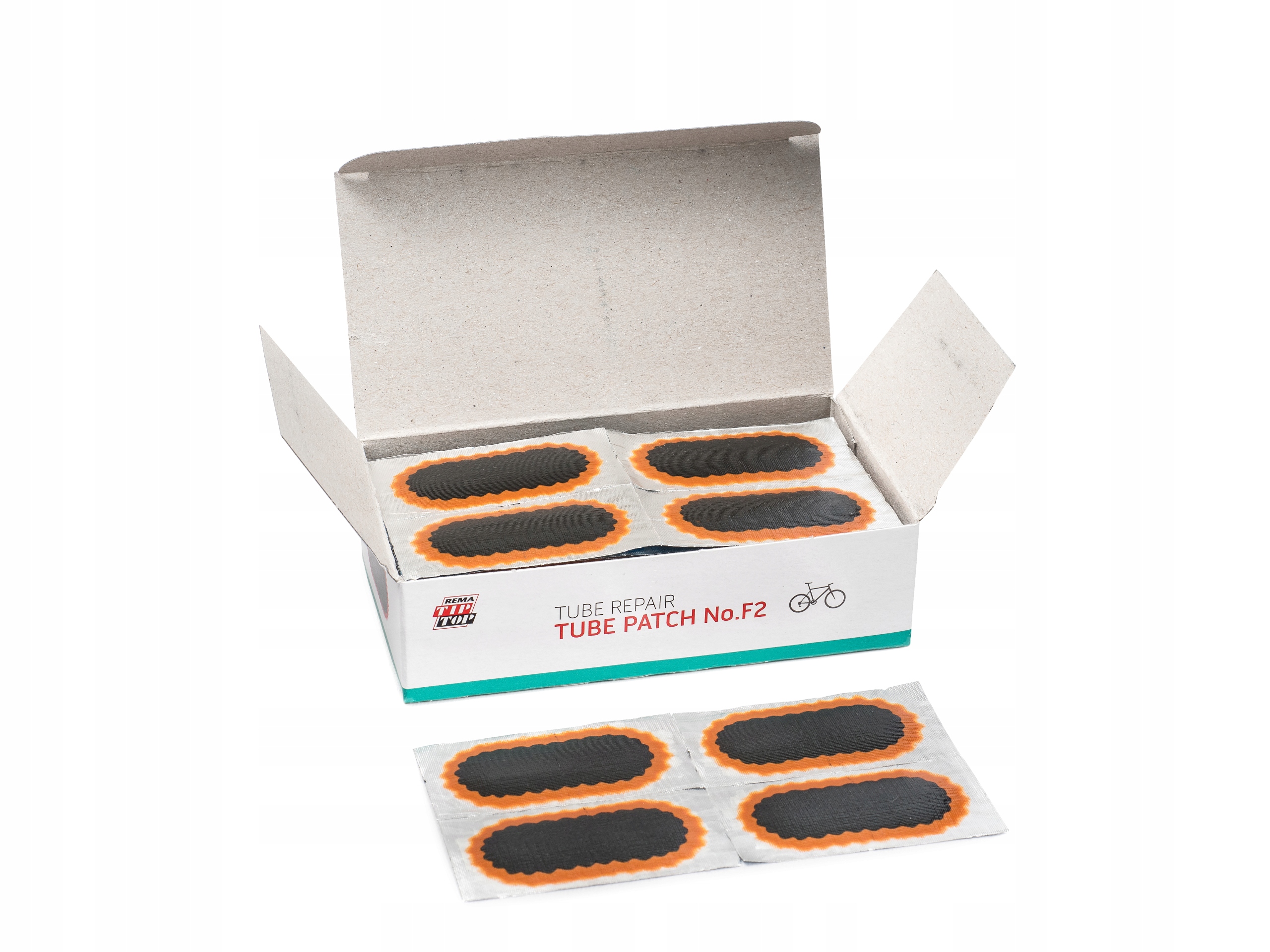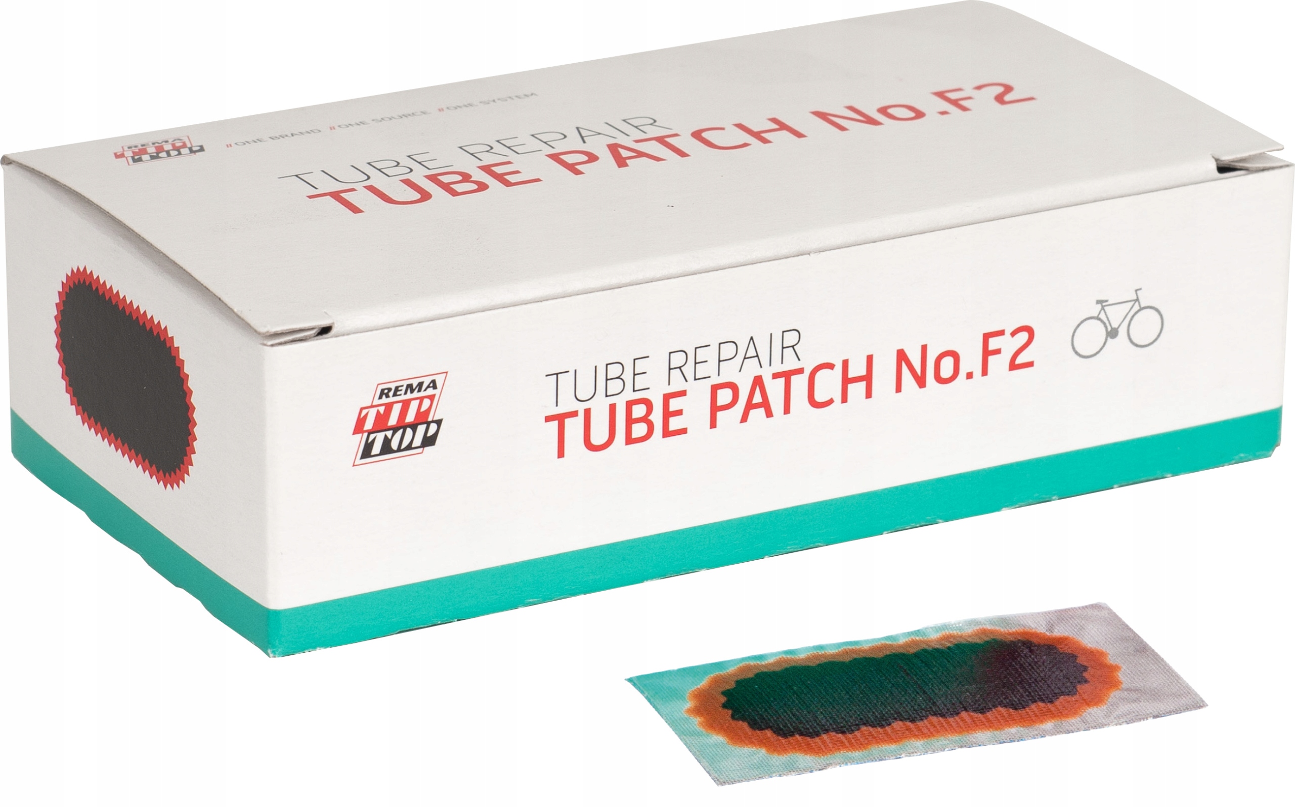 Заплатка № F2, розмір 50 x 25 мм, використовується для усунення пошкоджень камер велосипедів, розмір пошкодження обмежений розміром ремонтний матеріал.