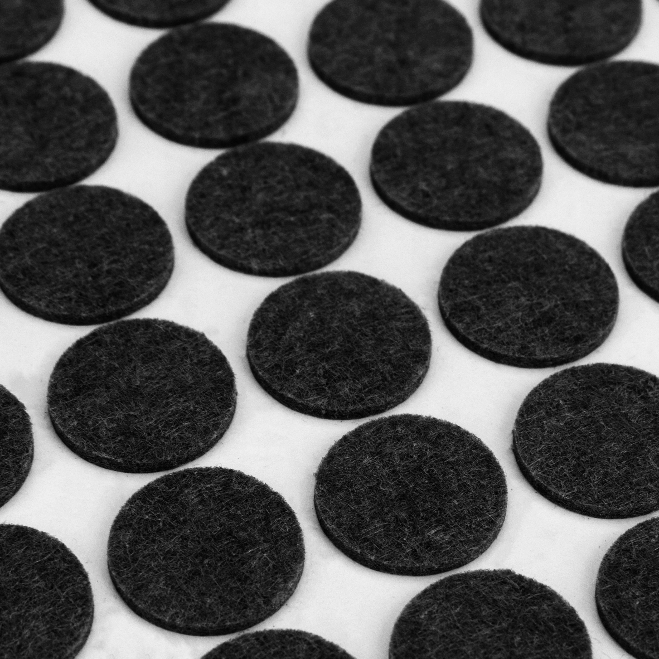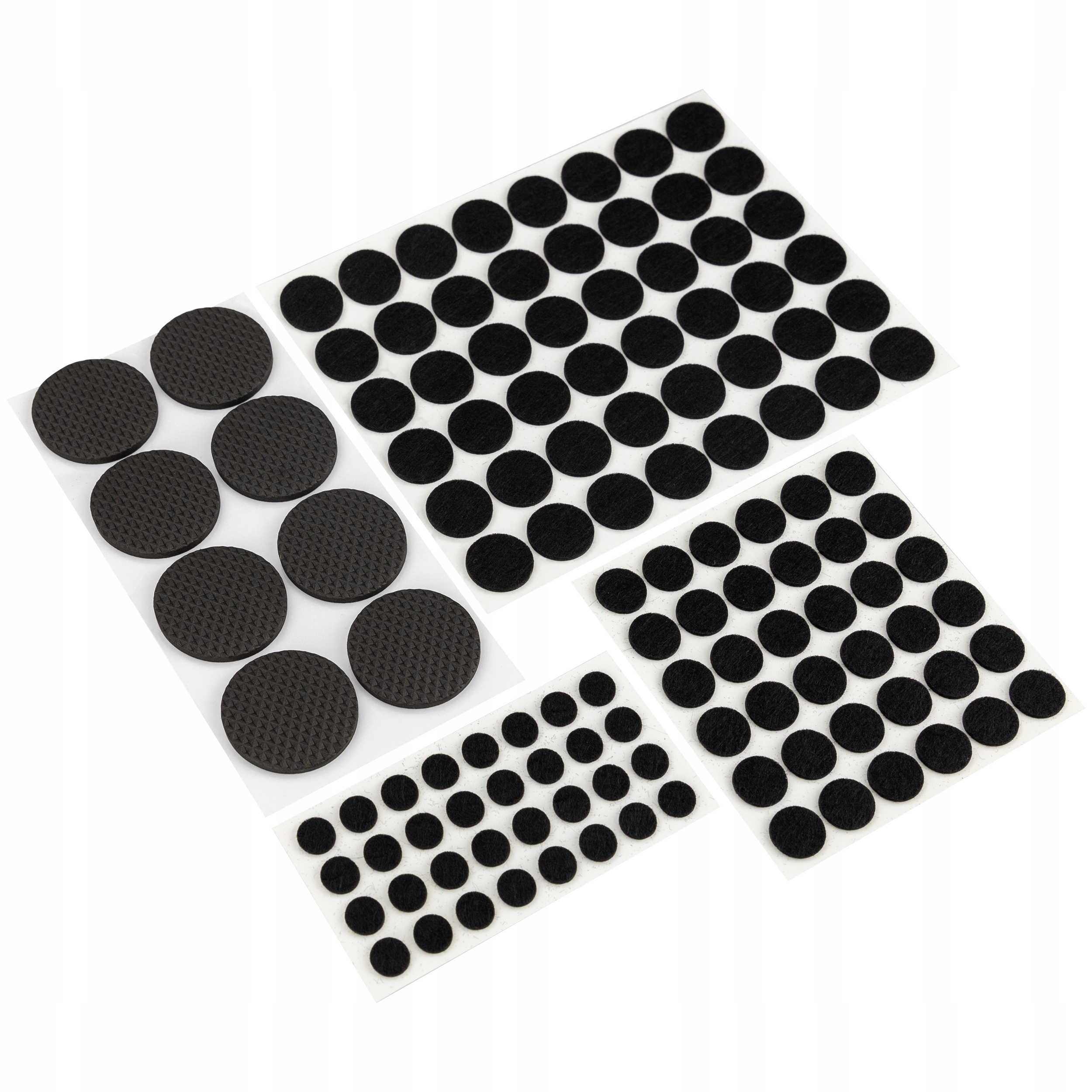Накладки не потребують використання інструментів, оскільки вони оснащені міцним клеєм на дні. Просто зніміть їх із щитка та помістіть у відповідне місце під меблями. Накладки виготовлені з дуже міцного повсті та поролону. У набір входить 125 предметів різних розмірів.