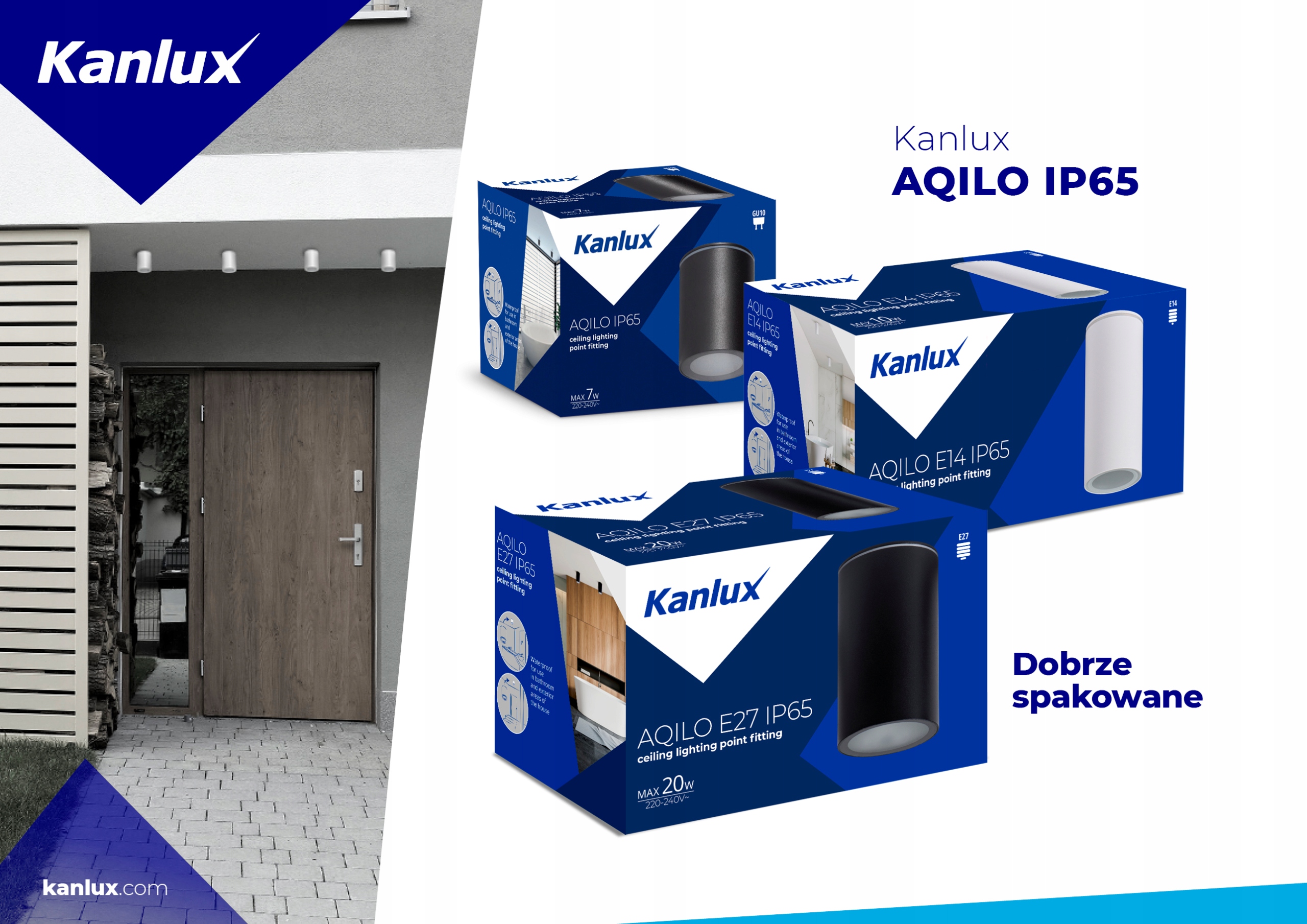 KANLUX AQILO — це наш перший подібний світильник для поверхневого монтажу високий ступінь герметичності - IP65. Він характеризується простим стилем і доступний у трьох кольорах: білому, чорному та графітовому. Висока герметичність призначена для приміщень, де світильники піддаються підвищеній вологості і ризику затоплення водою, в тому числі: ванна кімната та кухня, а також для використання на зовнішніх ділянках будинку, таких як тераси, балкони або криті входи. Ви можете вибрати джерела світла, які вам найкраще підходять для ламп.