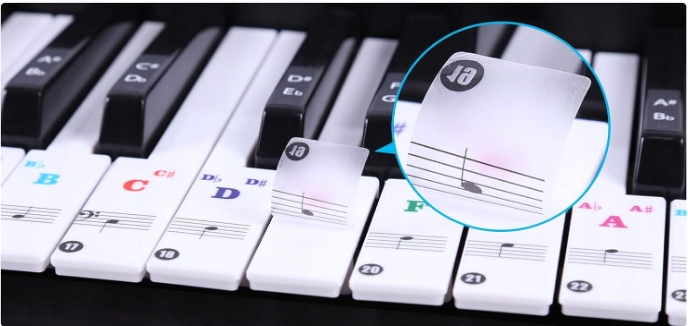 Практичний набір прозорих наклейок з барвистими звуковими позначками для простого та ефективного навчання грати в клавіатури, фортепіано, синтезатор, фортепіано чи акордеон. Запрошена допомога на перших кроках із навчанням для гри на клавіатурі. Швидкий і простий додаток для клавіш, і ви вже можете побачити назви звуків та нот, і навчання співає;)