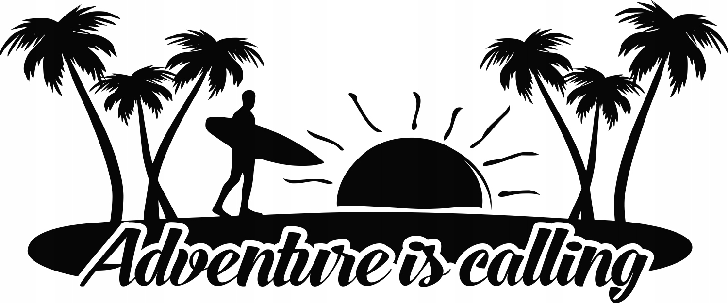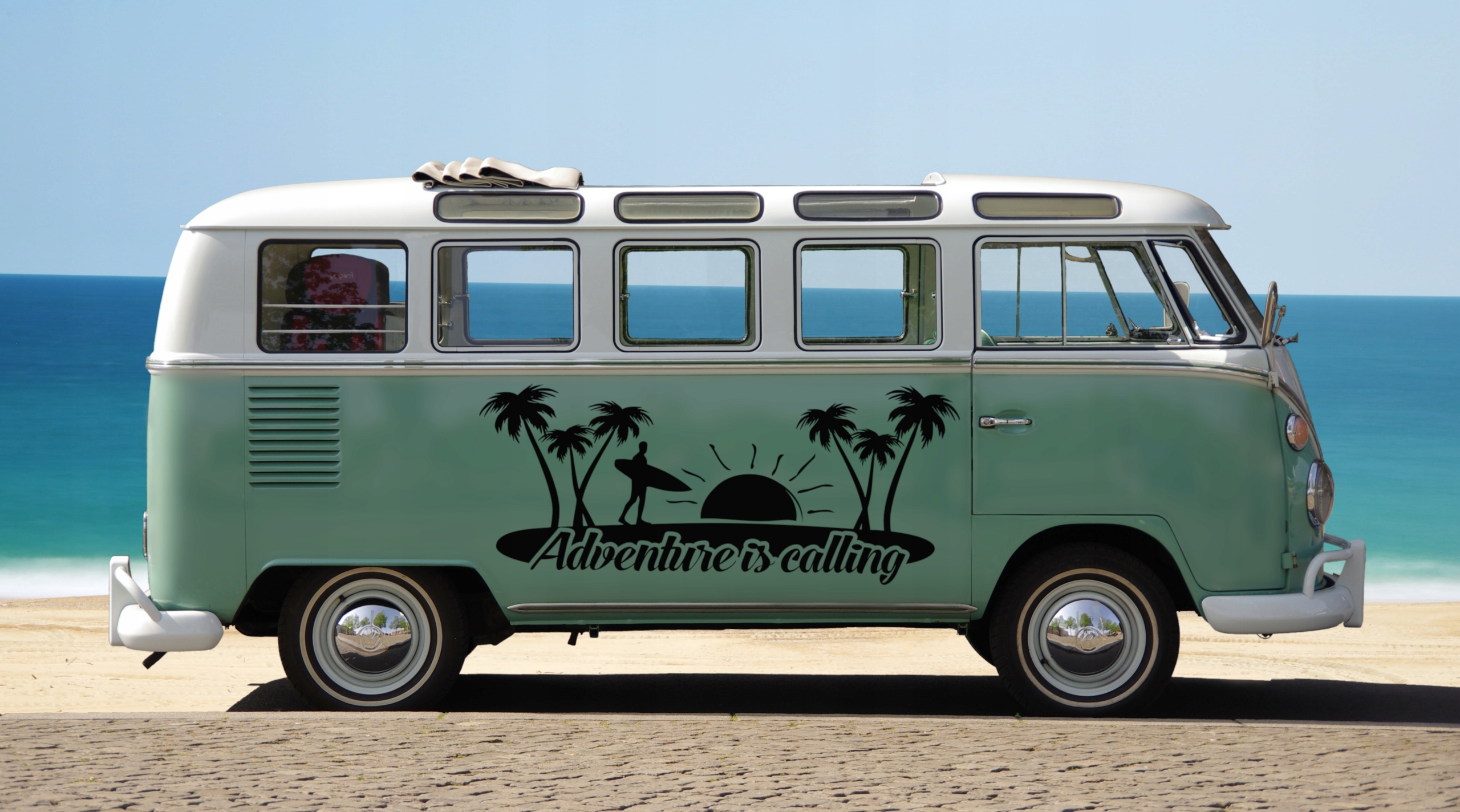 Предмет пропозиція - це наклейка, призначена для наклеювання на автомобіль, караван або кемпер. На ньому зображені пляж, пальми, серфінгіст, призахідне сонце та напис. Наклейка не має фону, вона вирізана в обраному кольорі з матової самоклеючої фольги німецької компанії Oracal. Після наклеювання на автомобіль залишаються лише елементи, видимі чорним кольором на фотографії нижче.