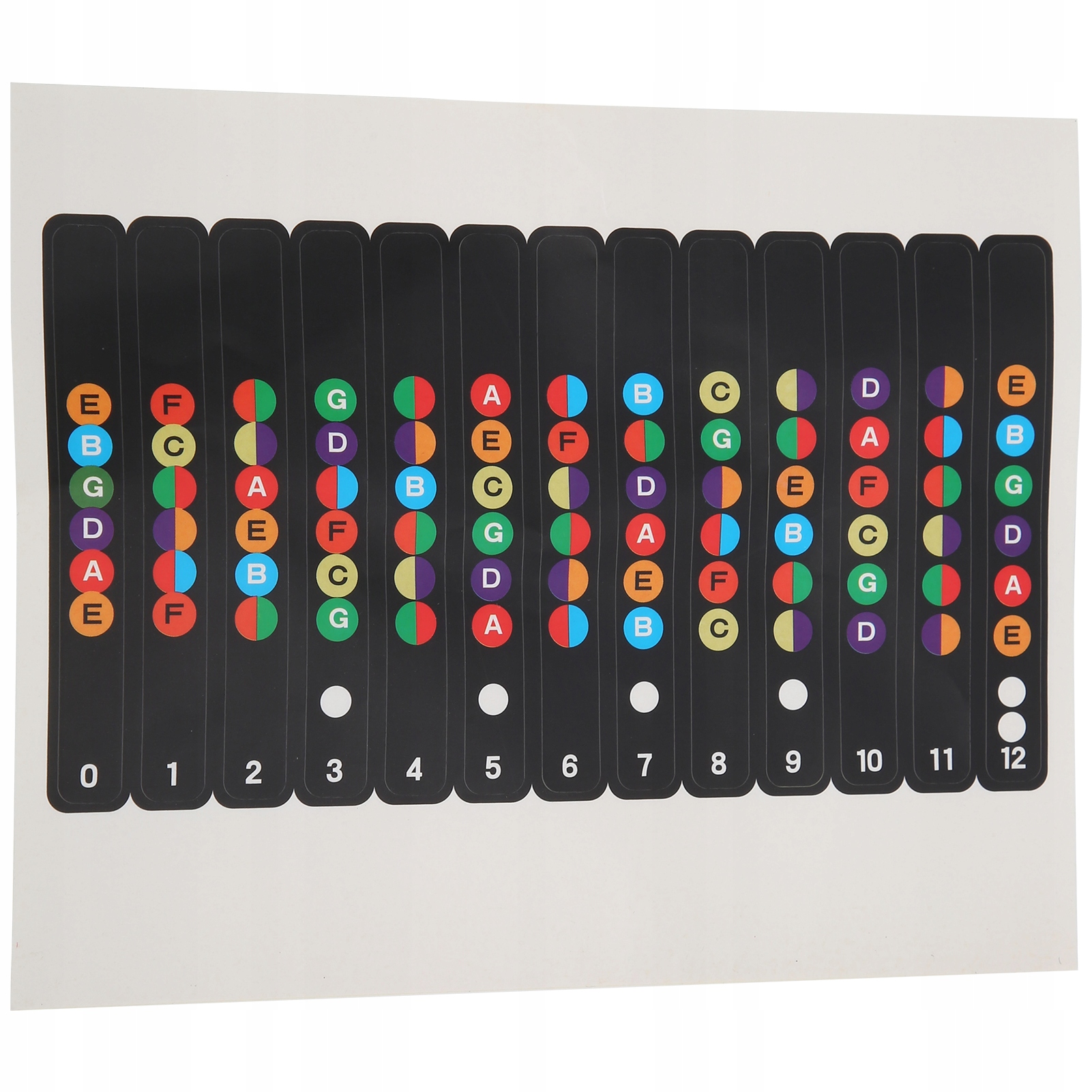 1. Граючи в акорді, краще бачити ноти, що складають акорд. Використовуючи спеціальний клей, після пастіння або розриву, клей не залишиться і може бути використаний. Наклейка виготовлена з вінілового матеріалу, який є водонепроникним та масляним, що може захистити гітарну дошку від забруднення. Підходить для всіх 6-струнних електричних гітар та акустичних гітар, може допомогти навчитися грати на гітарі та освоїти дошку. Барвисті надруковані наклейки є більш привабливими і є практичним доповненням до гітарних вправ, що підходять для гітаристів -початківців.