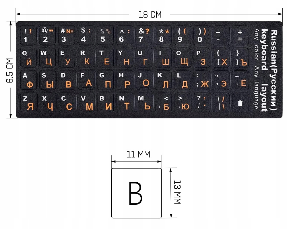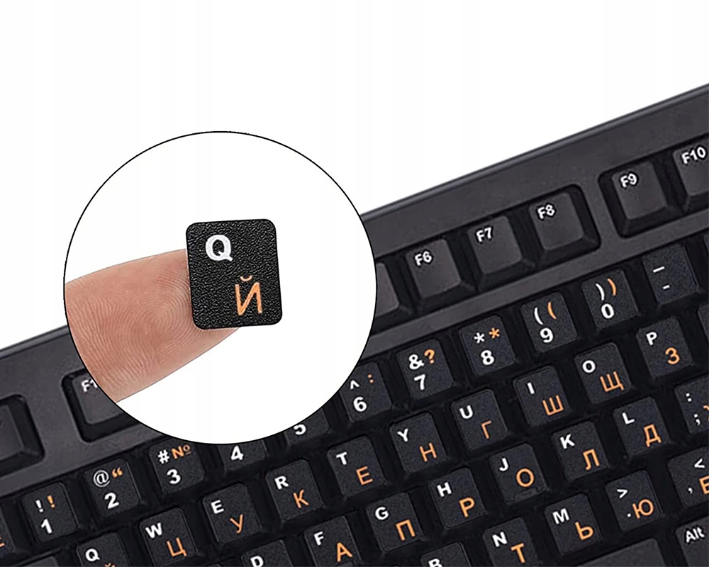 Наклейки на клавіатуру - це продукт, який дозволить вам оновити зовнішній вигляд вашого пристрою та змінити розкладку клавіш - наклейки містять як символи QWERTY, надруковані білим кольором, так і кирилицю оранжевого кольору. Міцний клей і висока якість використовуваних матеріалів забезпечують тривалий термін служби. Виріб є пило- та водонепроникним, тому захистить ваш пристрій від бруду. Наклейки ідеально підходять як для стандартної, так і для клавіатури ноутбука.
