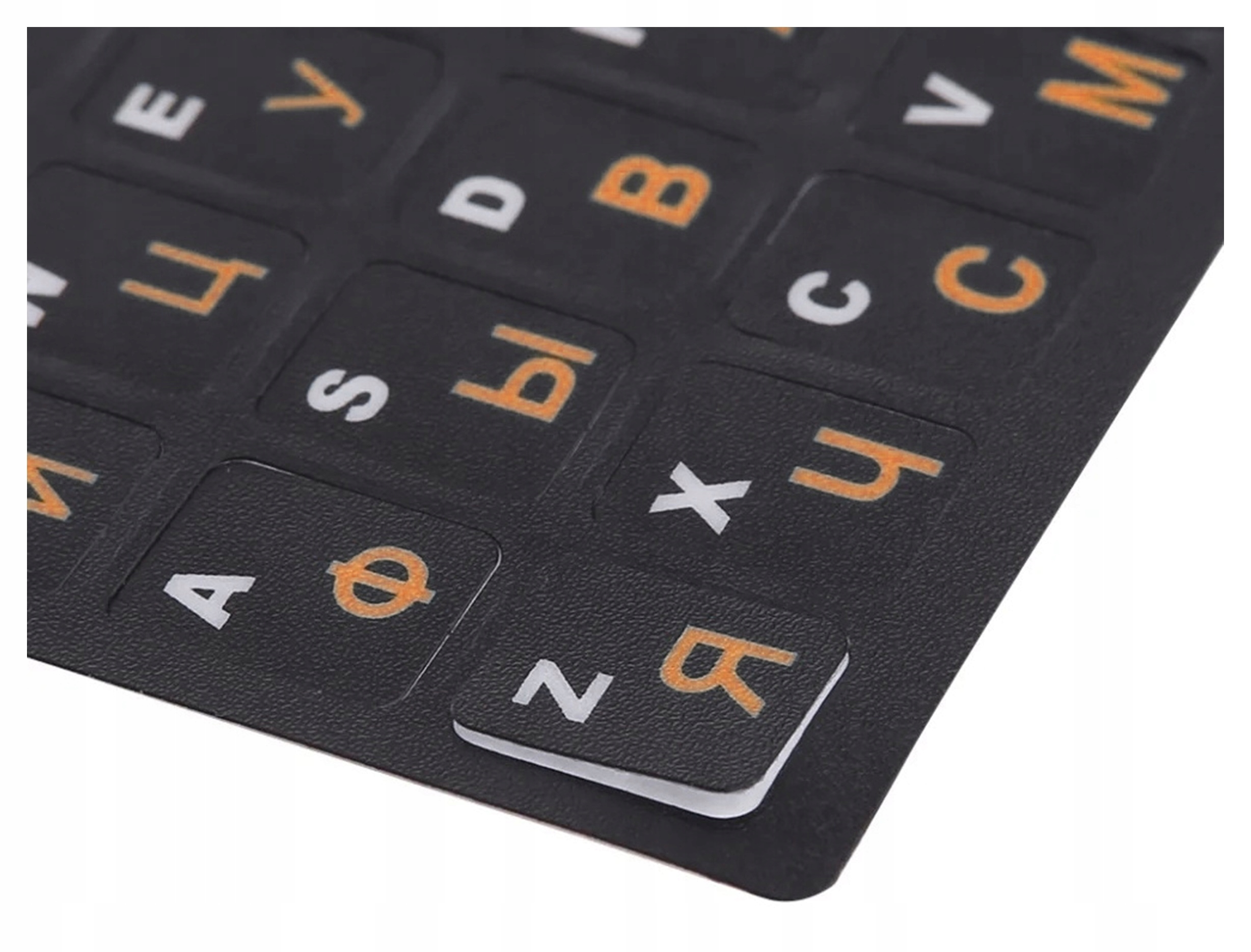 Кожна наклейка містить Латинські літери, і кирилики - що дозволяє одночасно використовувати обох алфавіту. Завдяки цьому ви не втрачаєте орієнтацію клавіатури і можете легко переключити мови.