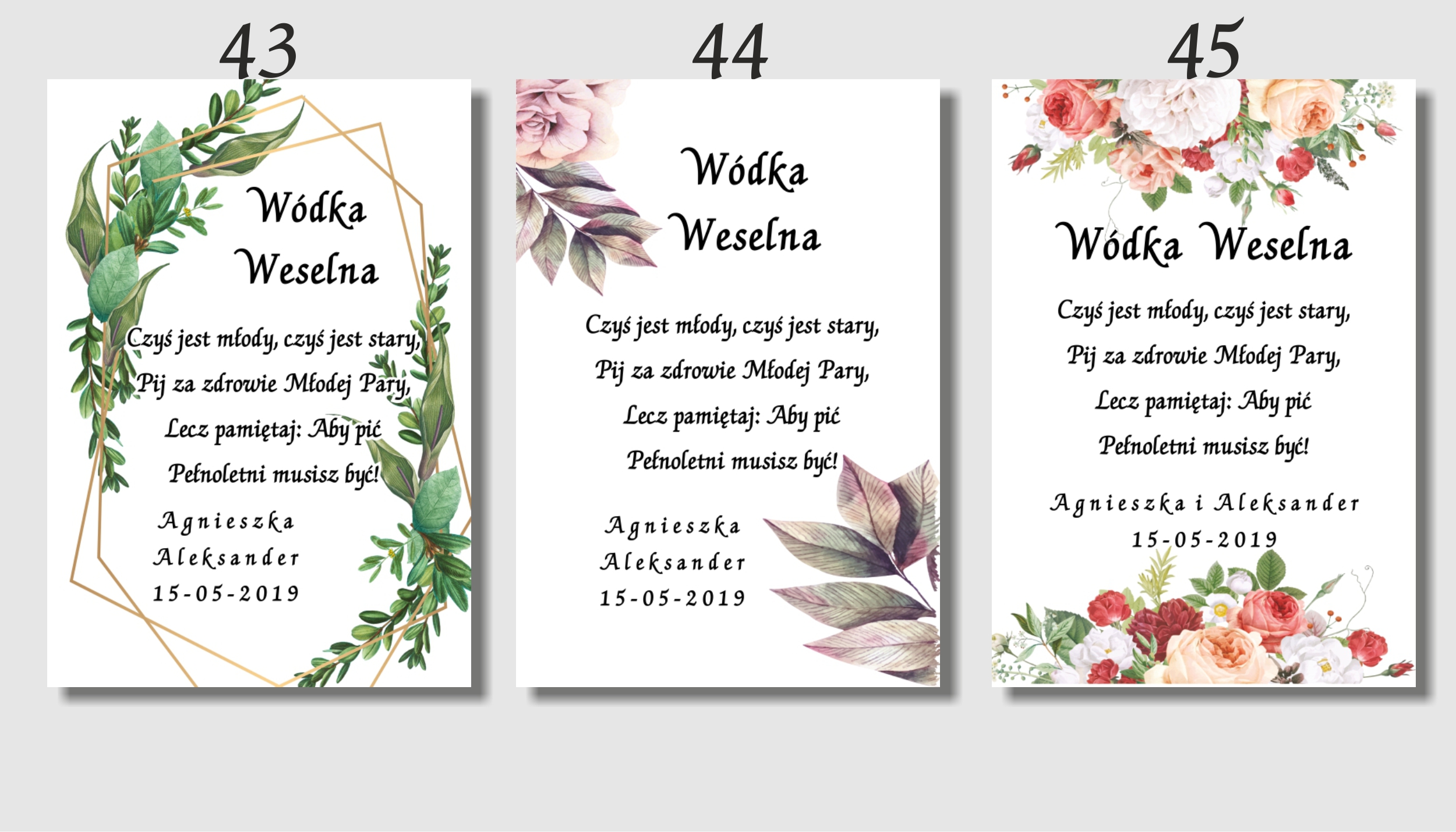 - Дизайн (підбір візерунка, персоналізація імен наречених, дати весілля, вірші та шрифту. Напис «ВЕСІЛЬНА ГОРІЛКА» можна змінити на власний текст, наприклад «ВЕСІЛЬНЕ ВИНО» », «STAROSTÓWKA», за визнанням)