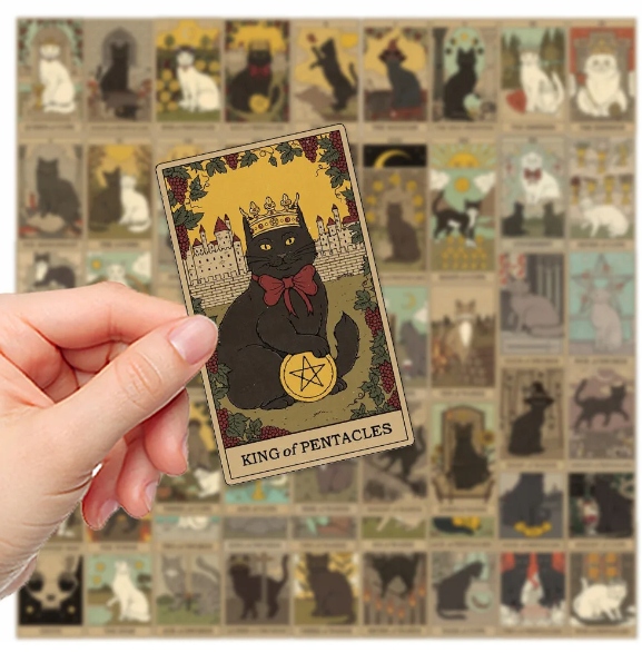- Кумедні коти на картах Таро: кожна наклейка є кумедним зображенням кота в контексті карт Таро, що робить їх ідеальним доповненням для любителів котячої магії.