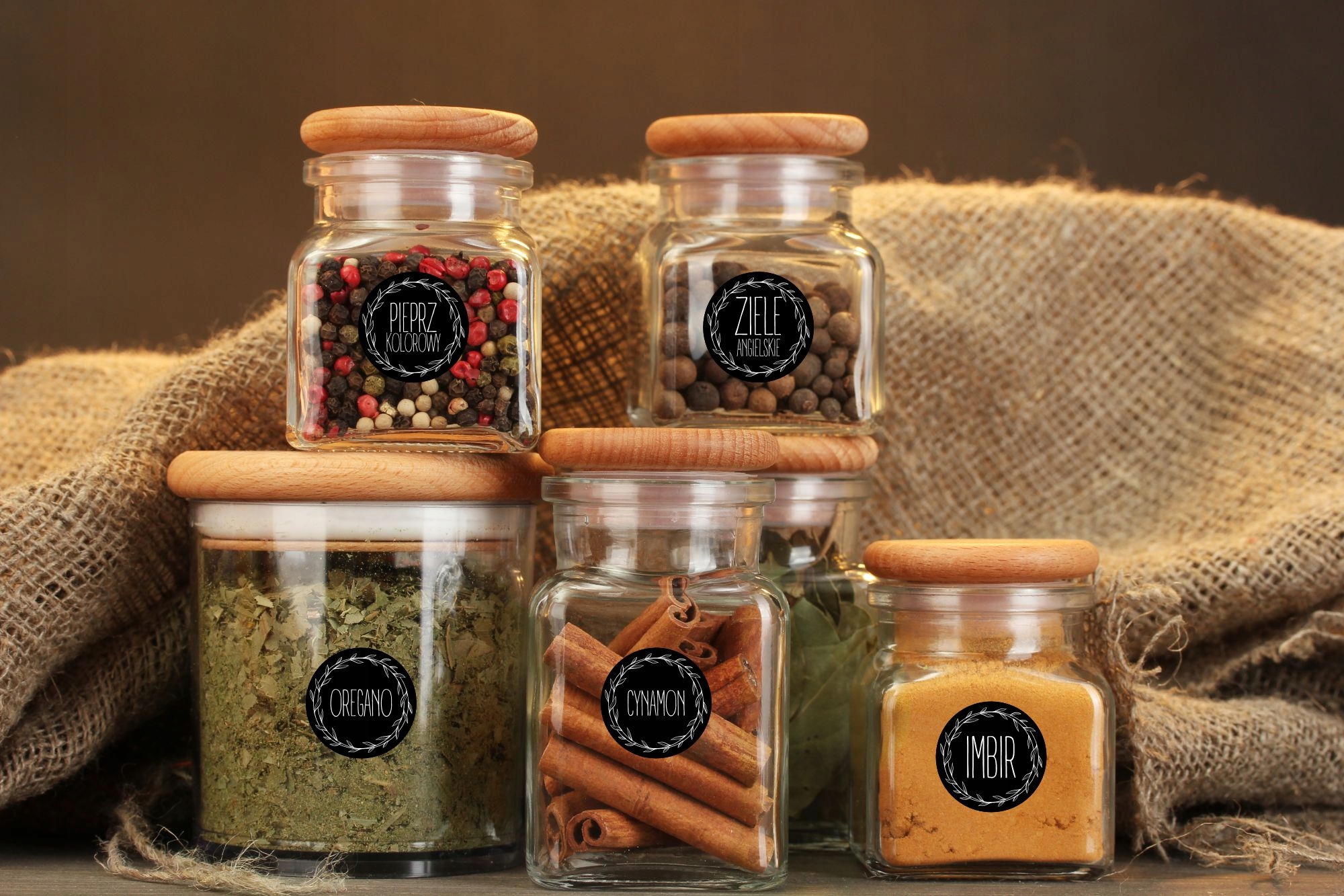 Набір з 108 надрукованих наклейок з іменами більшості спецій та трав. Набір включає 12 наклейок з порожнім полем, на якому ви можете записати назви спецій, які відсутні. Завдяки мінімалістичному дизайну він підходить для будь -якого стилю кухні.