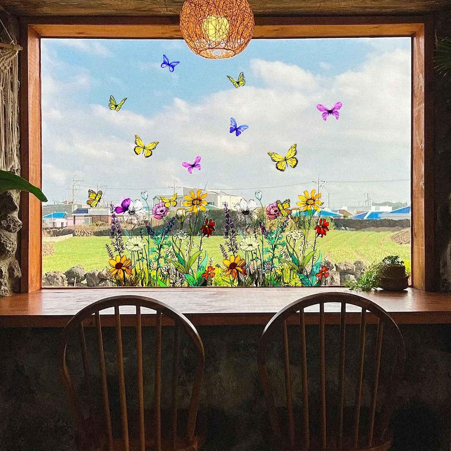 Наклейки на стіни Вікно Різнобарвні квіти луг МЕТЕЛИКИ Вінілові декоративні