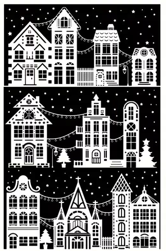 • 9 аркушів наклейок із зображенням: будинків, ялинок, зірок та вогників