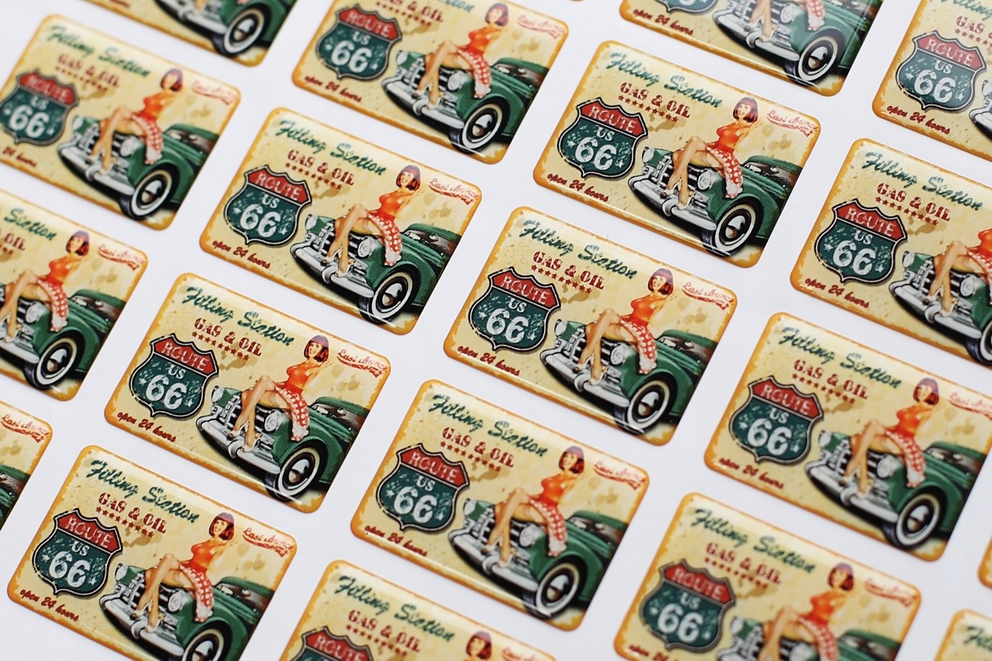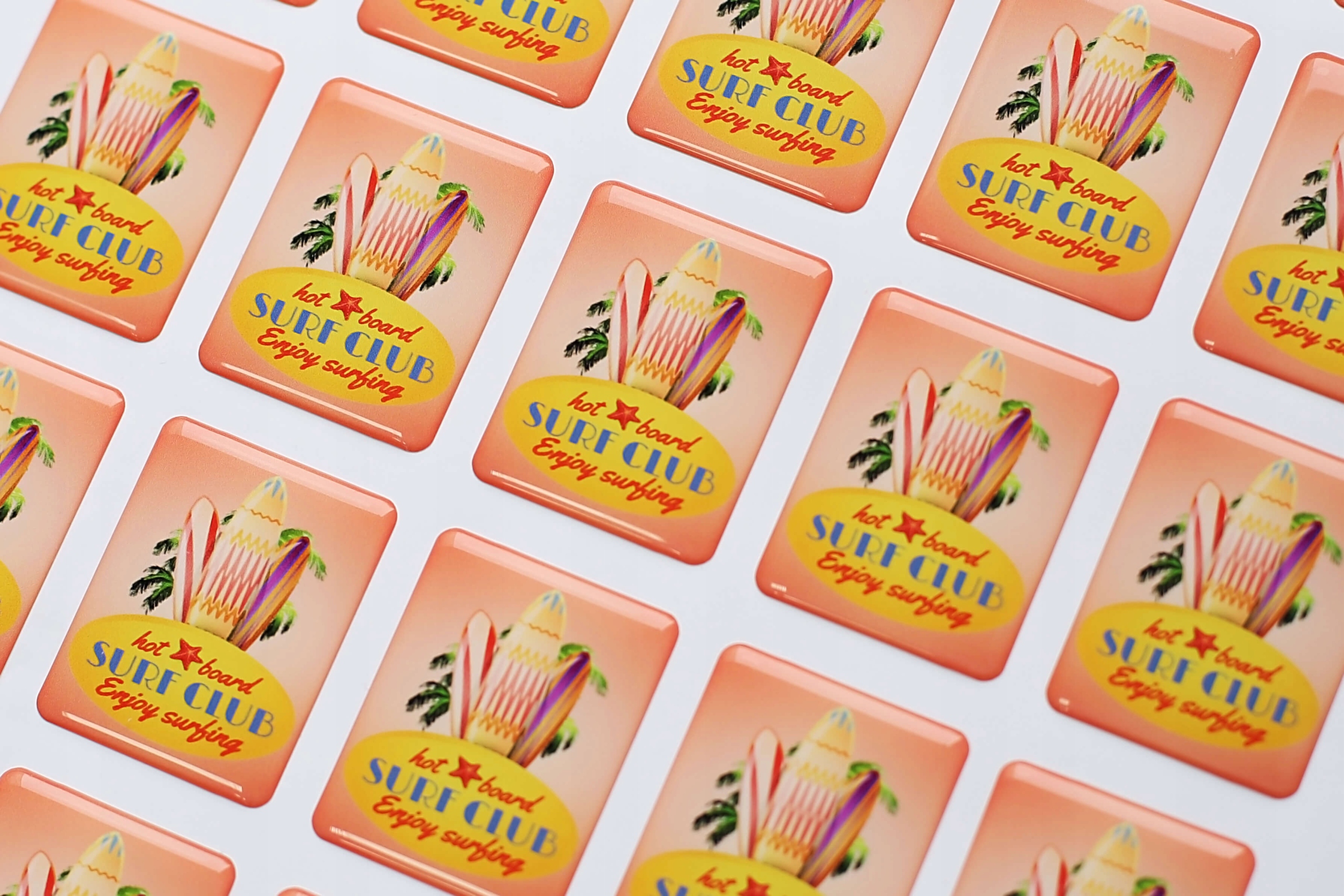 Наклейки, надруковані на самоклеючій фользі, покриті поліуретановою смолою, що надає їм опуклу форму та підвищує довговічність. Вони стійкі до зовнішніх погодних умов: опадів, вологи та УФ-випромінювання. 3D наклейки мають дуже широкий спектр застосування. Вони відмінно підходять для реклами з логотипом компанії на автомобілях, комп'ютерах, меблях, електроніці та побутовій техніці.