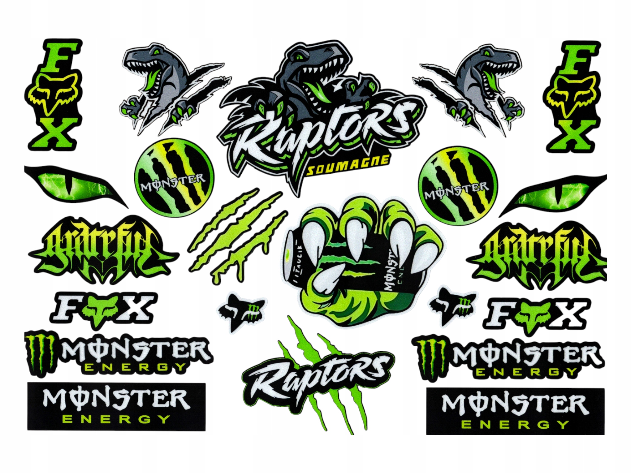 NAKLEJKI NA MOTOR MOTOCYKL ROWER SKUTER CROSSA MONSTER RAPTORS FOX ZESTAW