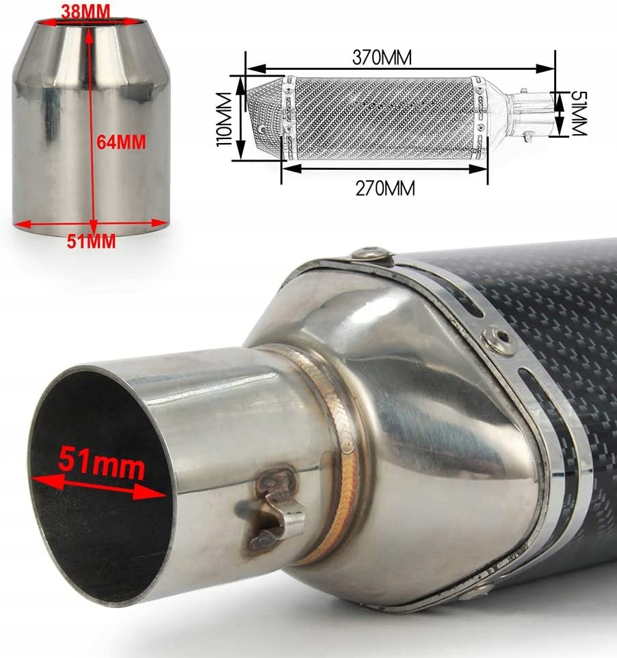 - Це універсальний глушник звуку, який можна використовувати для Dirt Bike, вуличні мотоцикли Велосипеди, скутери, квадроцикли, квадроцикли та будь-які інші велосипеди з діаметром труби 38-51 мм