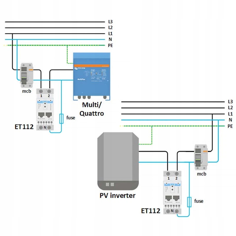 Лічильник електроенергії E340 Meter від Victron Energy призначений для вимірювання електроенергії, наприклад, безпосередньо в розподільній коробці або як джерело живлення лічильник виробництва миттєвої та кВт*год сонячною електростанцією. Одним із найважливіших застосувань є вимірювання струму в накопичувачах енергії, щоб енергія в батареях використовувалася, коли мережева сонячна електростанція не виробляє електроенергію, наприклад, у похмурий день або вночі. Його можна підключити, залежно від версії, за допомогою кабелю RS486 або Ethernet. У енергоакумуляторах СЕ зазвичай використовуються лічильники електроенергії ЕТ (для однофазного струму з максимальною силою 100 А) і ЕТ340 (для трифазного струму з максимальною інтенсивністю 65 А). У набір входить кабель для підключення до пристрою MultiPlus-II GX довжиною 1,8 м. На вимогу клієнта кабель довжиною 5 м.