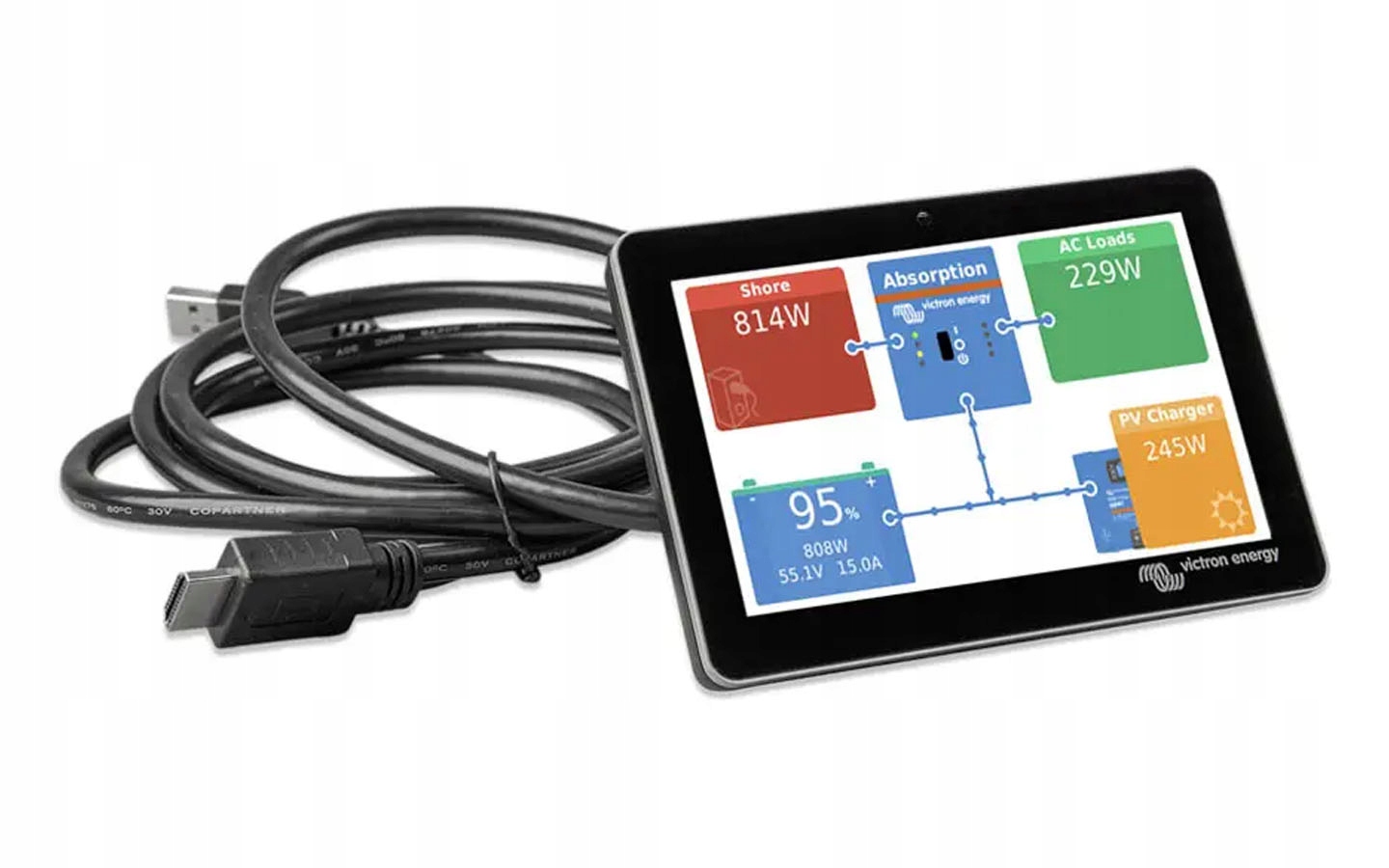 GX Touch 70 — це доповнення до дисплея для пристроїв Cerbo GX. П'ятидюймовий сенсорний екран забезпечує миттєвий огляд вашої системи та дозволяє миттєво налаштувати параметри. Просте підключення до Cerbo GX за допомогою одного кабелю, його надтонка водонепроникна конструкція, конфігурація верхнього кріплення та проста установка забезпечують велику гнучкість для створення чіткої та чистої приладової панелі. GX Touch 70 є компаньйоном Cerbo GX, абсолютно нового комунікаційного центру, що дозволяє вам завжди мати ідеальний контроль над системою з будь-якого місця та максимізувати її ефективність. Просто підключіться через наш портал віддаленого керування Victron (VRM) або отримайте прямий доступ через GX Touch 70, MFD або наш додаток VictronConnect завдяки доданій функції Bluetooth. Це останнє доповнення до серії GX поєднує в собі найкращі можливості підключення, переосмислюючи розумні енергетичні рішення в усіх відношеннях.