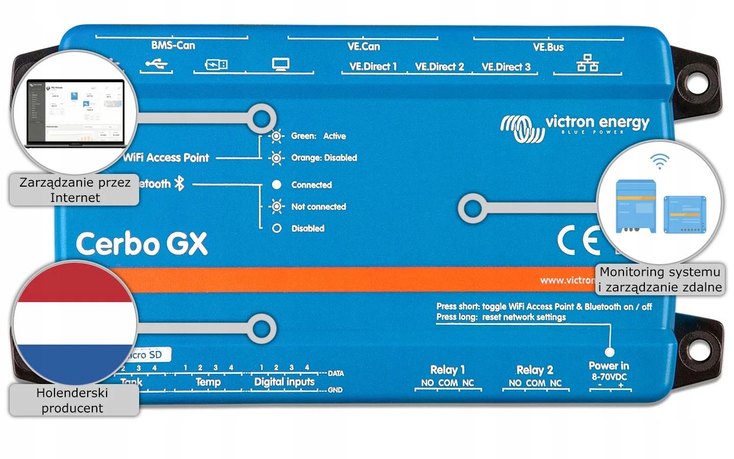 Пристрій Cerbo GX є інтегрованою точкою керування для всіх пристроїв Victron Energy. Має багато портів Ve.Direct і VE.Bus, а також порти для контролю рівня рідини, наприклад, у резервуарі для води. Крім того, він дозволяє контролювати систему через портал VRM і спілкуватися через традиційний Ethernet або WiFi. Опціонально можливе спілкування через встановлений на телефон додаток Victron Connect і протокол BlueTooth. За бажанням він дозволяє підключити сенсорний дисплей GGX touch 50 і представити результати на кольоровому дисплеї. Найважливішою перевагою є універсальність, сумісність з усіма пристроями Victron Energy із портом VE.Direct або VE.Bus і простота налаштування.