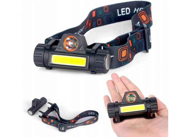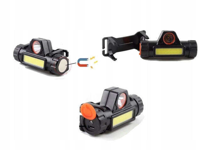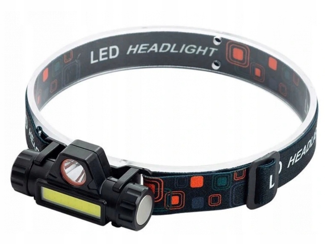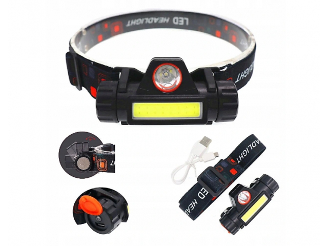 Міні-налобний ліхтар з двома світлодіодами (XPE + стрічка COB) з акумулятором і зарядкою через USB, з магніт, регульований нахил і ремінь.