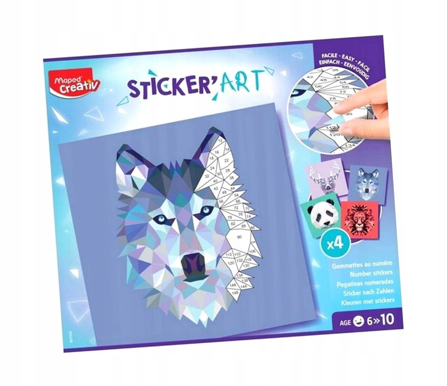У набір входить 4 картонні дошки (20 см х 20 см) з надрукованими портретами тварин (вовк, панда, лев і олень), розділеними лініями на елементи для наклеювання наклейки з цифрою, 5 аркушів наклейок, картонний клин, який можна використовувати як підставку для картини.