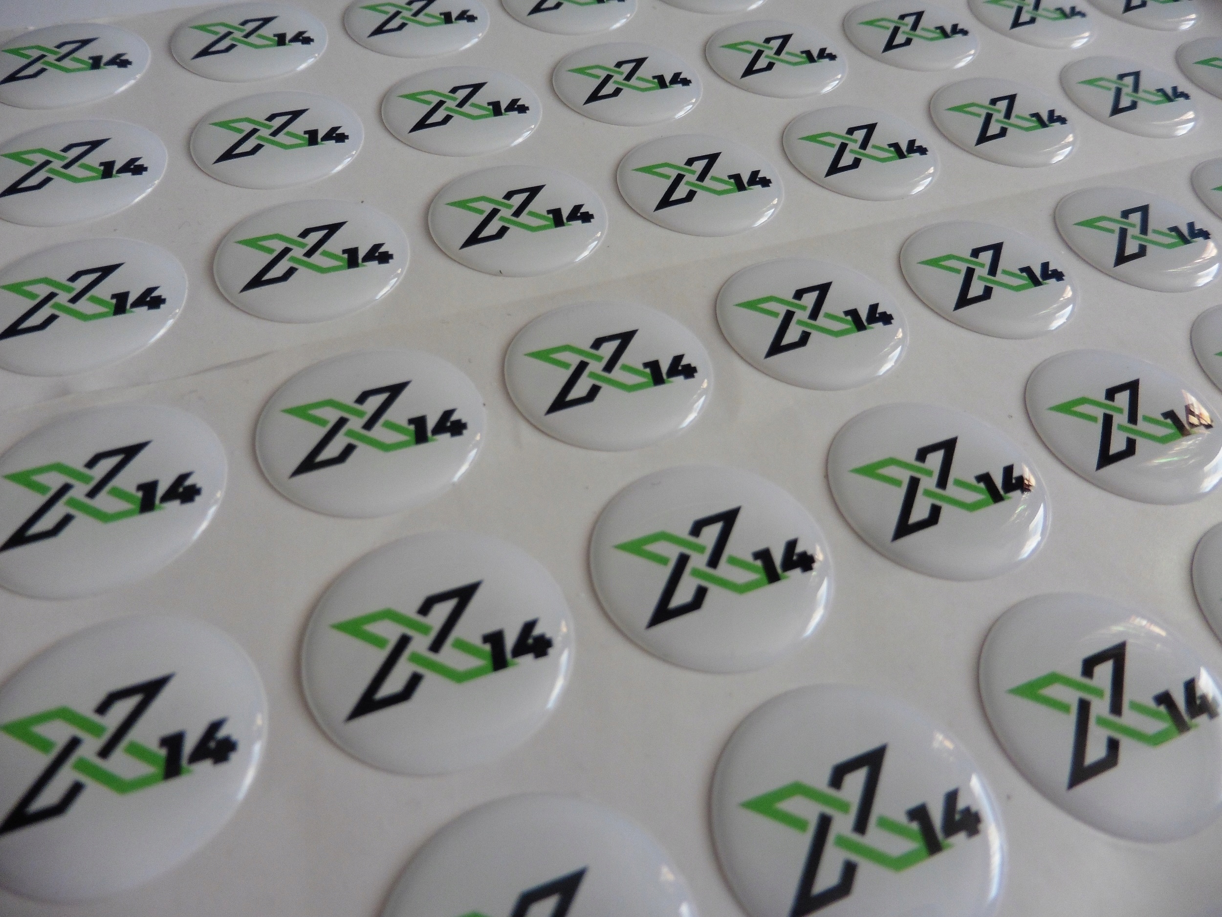 Друк 4+0 CMYK відбиток вирізається за допомогою плотера в потрібну форму. Потім його покривають прозорою смолою. Через фізичні властивості смоли дизайн не може містити гострих кутів – усі кути мають бути закругленими (мінімальний радіус заокруглення кожного кута становить 1 мм).