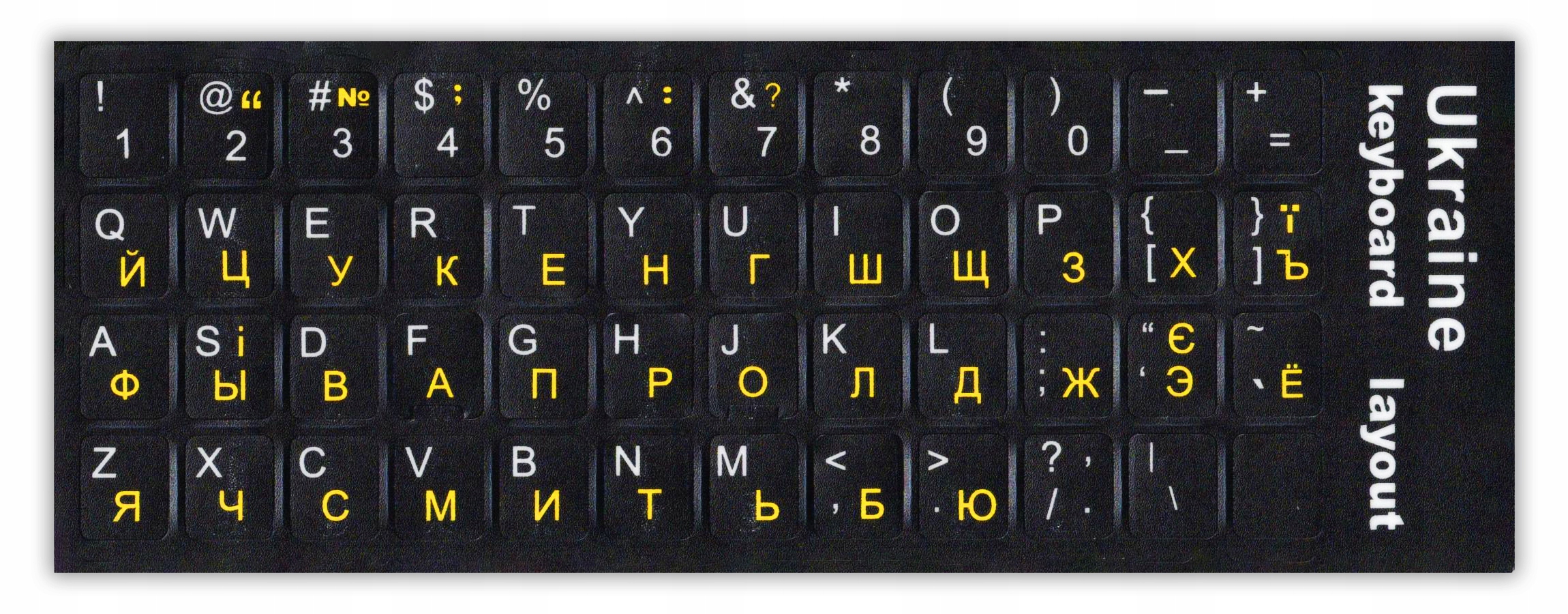Якісні універсальні наклейки на клавіші клавіатури з додатковим шрифтом українською мовою. Знаки надруковані спеціальним методом друку, який гарантує високу стійкість до стирання. Закруглені кути гарантують легкість нанесення та захищають від стирання та відшарування. Завдяки універсальному зовнішньому вигляду вони ідеально підходять до будь-якої клавіатури (чорного кольору з жовтими буквами).